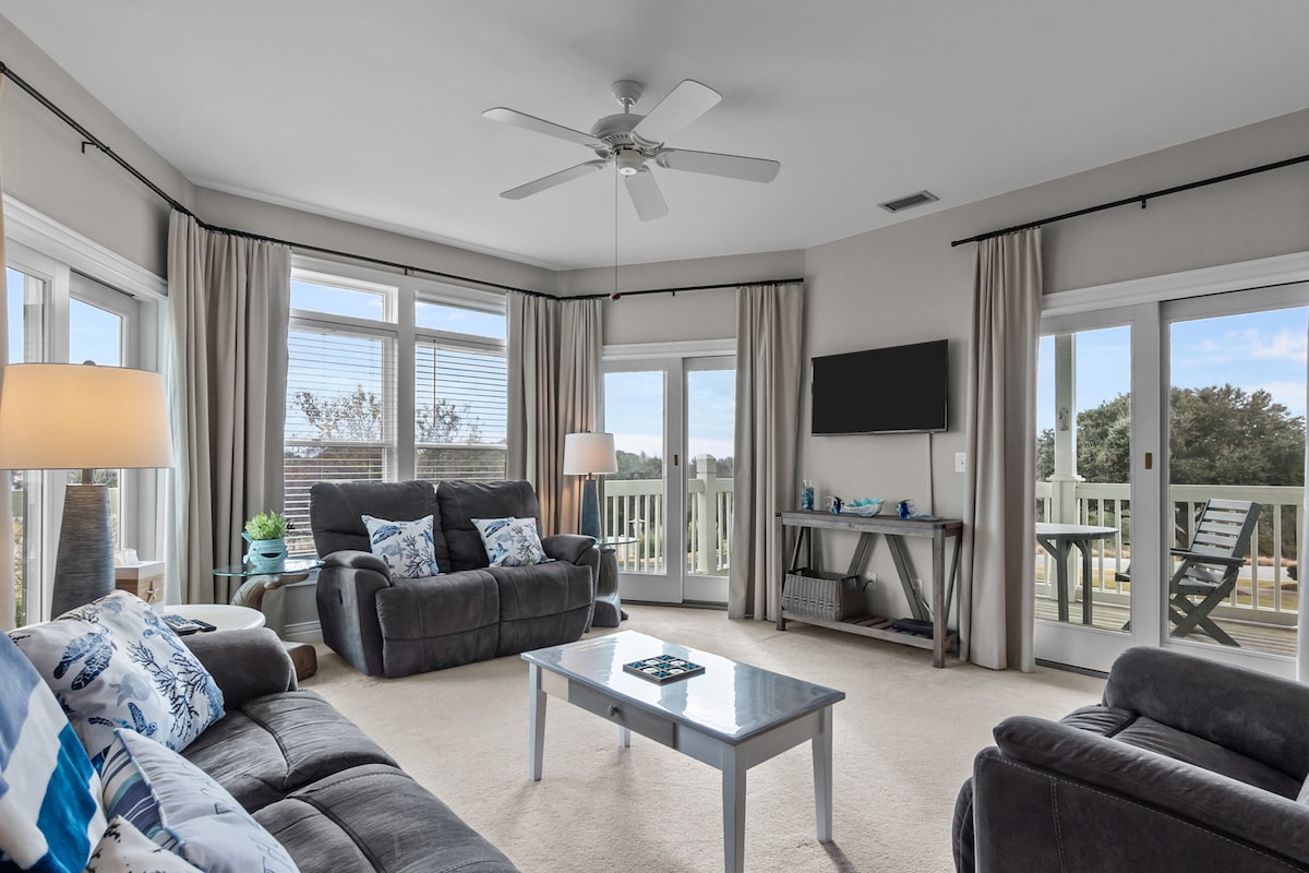 A MENOS DE 1 MINUTO A PIE DE LA ORILLA DEL AGUA. Fantástica casa de playa con 3 dormitorios, 3 baños, sala de estar-comedor con techos abovedados, cocina, TV en 4 habitaciones, Wi-Fi, terraza grande con parrilla Weber de gas natural, lavadora-secadora. Excelentes vistas al agua mientras te relajas en la terraza. ¡Muchas prestaciones! Solo traé tu traje de baño. ¡Todos nuestros huéspedes dijeron que les encanta este lugar! Muy cerca de muchos lugares para bodas, restaurantes, parque estatal, paseo marítimo frente al mar, bases militares, etc.