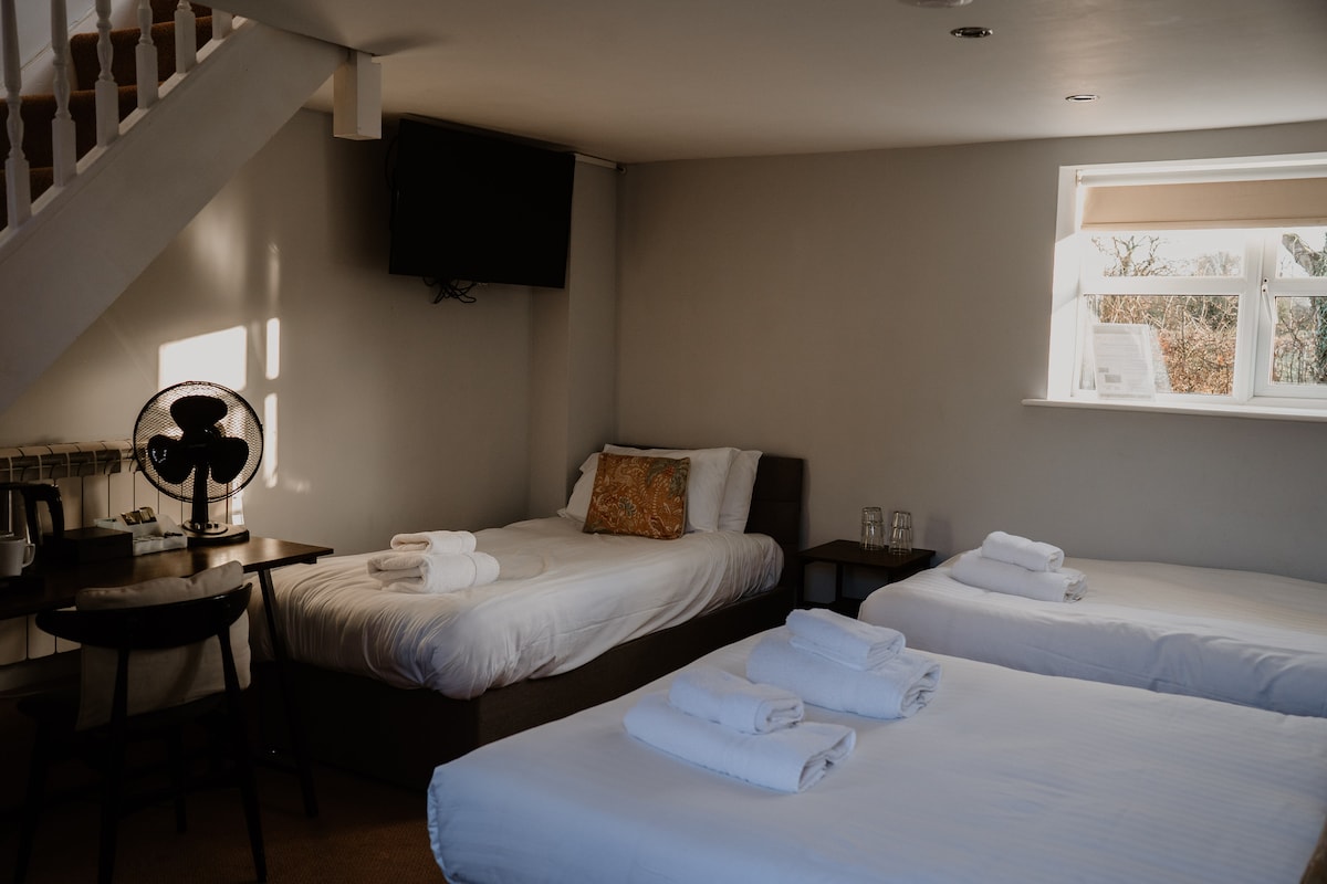 ¡Esta divertida y bellamente renovada habitación Triple Deluxe es la habitación más comentada aquí en Shrigley Hall Hotel & Spa, y por todas las razones correctas! Tres lujosas camas dobles tamaño king, muebles contemporáneos, instalaciones en suite con baño independiente y duchas dobles. ¡Tiene capacidad para seis huéspedes, perfecto para familias, perfecto para fiestas! Todas las tarifas son solo para habitaciones: desayuno disponible por un cargo adicional.