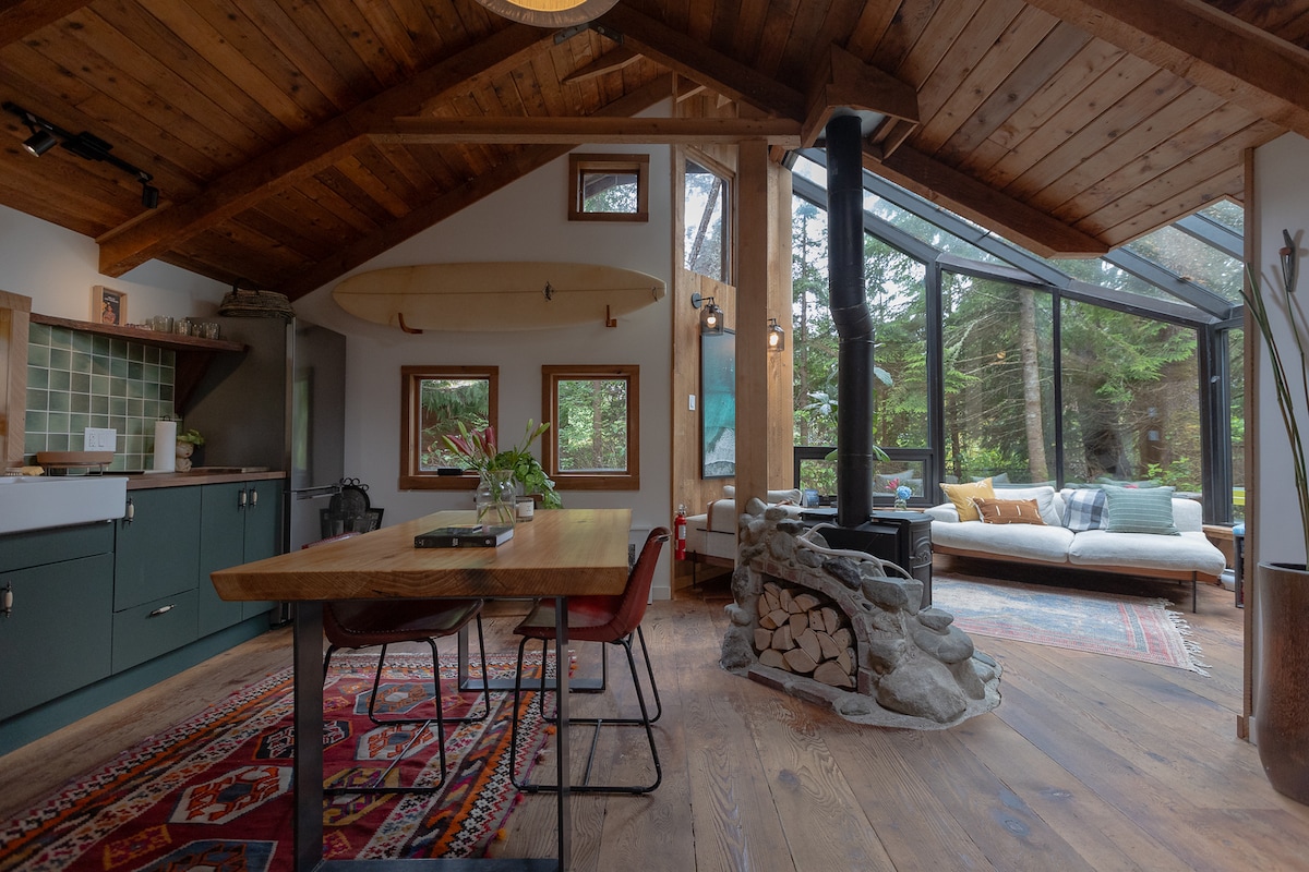 A pocos pasos del sendero de acceso a la playa de South Chesterman, esta impresionante cabaña de cedro de 3 dormitorios está construida en una propiedad privada de ½ acre ubicada entre árboles gigantescos de crecimiento antiguo. Clayoquot Retreat es una cabaña rústica original de la costa oeste con ventanas de 30 pies y comodidades actualizadas. Disfruta de la ducha caliente al aire libre después de un paseo/surf por la playa o acércate a un fuego con la estufa de leña. Relájate en el jacuzzi mientras contemplas el bosque y las estrellas. Escucha las olas del mar mientras duermes.