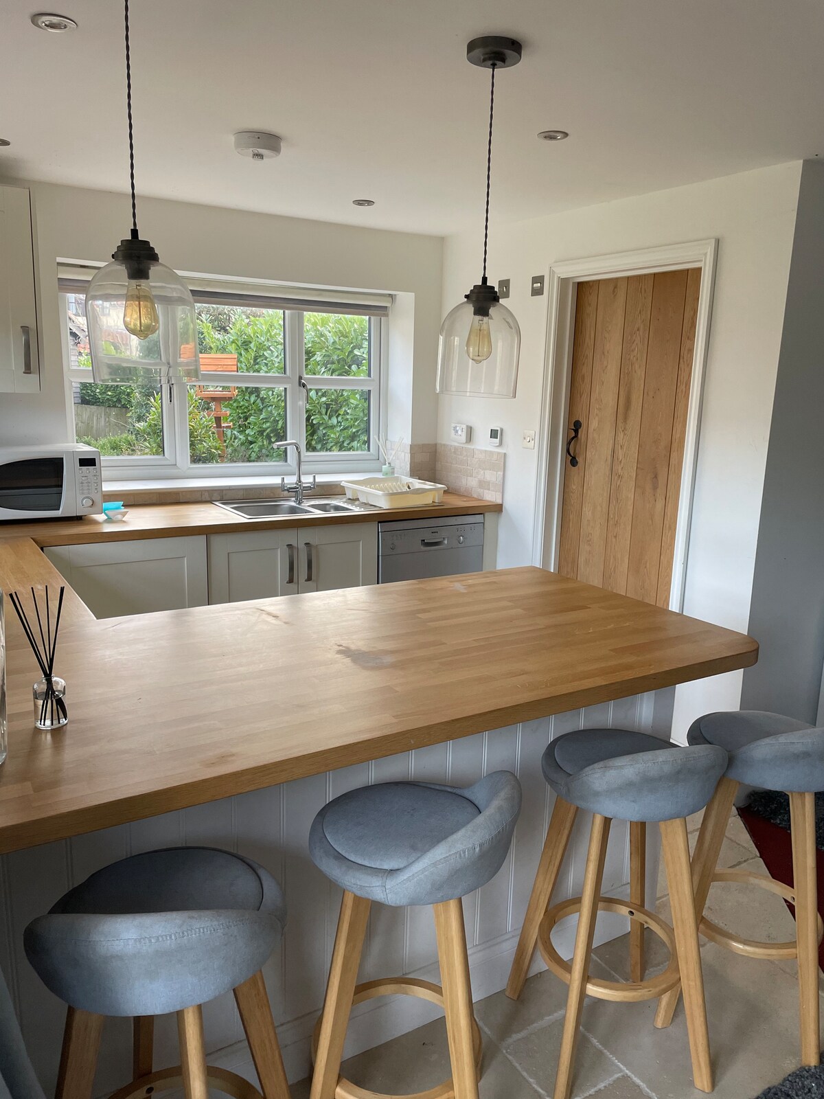 Nuestra cabaña ofrece una acogedora estancia independiente con una cocina totalmente equipada, salón, dormitorio con cama superking, ducha de lujo en suite y servicio con inodoro adicional. Esta casa ecológica tiene calefacción por suelo radiante y contiene muchos artículos reciclados, desde las tablas de andamios recuperadas del exterior hasta las muchas gemas reutilizadas que se encuentran en el interior. Al salir hay un patio privado orientado al sur y un jardín con su propio espacio de estacionamiento, todo a solo un paseo tranquilo de la ciudad.