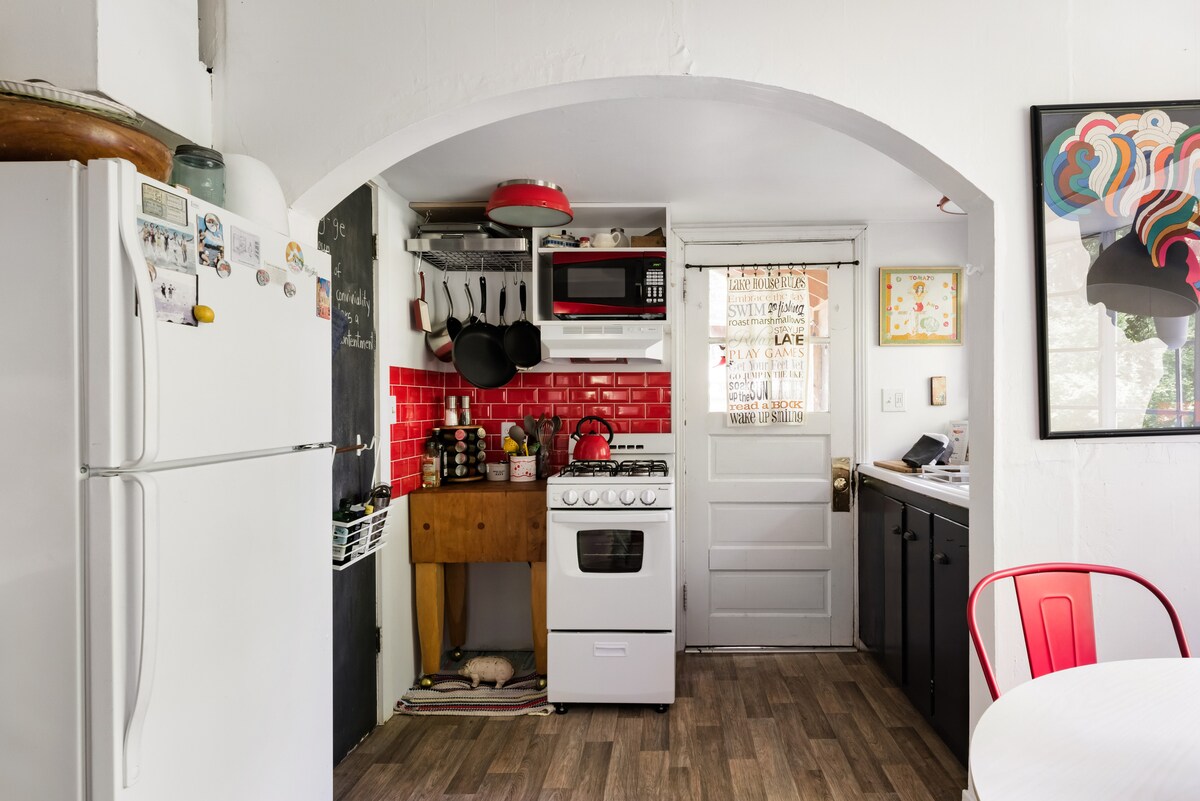 Relájate en una hamaca arcoíris en un porche cubierto y ventilado. Hay una sensación de casa de campo atemporal entre los suelos de madera, las vigas encaladas y las mantas caseras. Libros y música en abundancia, incluyendo una colección de discos y un póster vintage de Dylan. ADEMÁS: consulta el Protocolo de coronavirus de la cabaña para la tranquilidad de los huéspedes. Y: WIFI de 300 mbps.