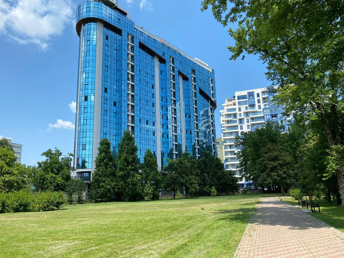 Ubicado en un moderno rascacielos en el corazón del centro de la ciudad, junto al Parque de la Catedral. Este es uno de los pocos edificios en Chisinau con conserje y seguridad 24/7 directamente ubicado en el vestíbulo para un máximo de seguridad. El edificio cuenta con un gimnasio totalmente equipado y un parque infantil seguro al aire libre. La calefacción y el agua caliente en los apartamentos son proporcionados por un sistema de calefacción central confiable. Cada apartamento está equipado con un sistema de intercomunicación de video. Aparcamiento gratuito en la calle.