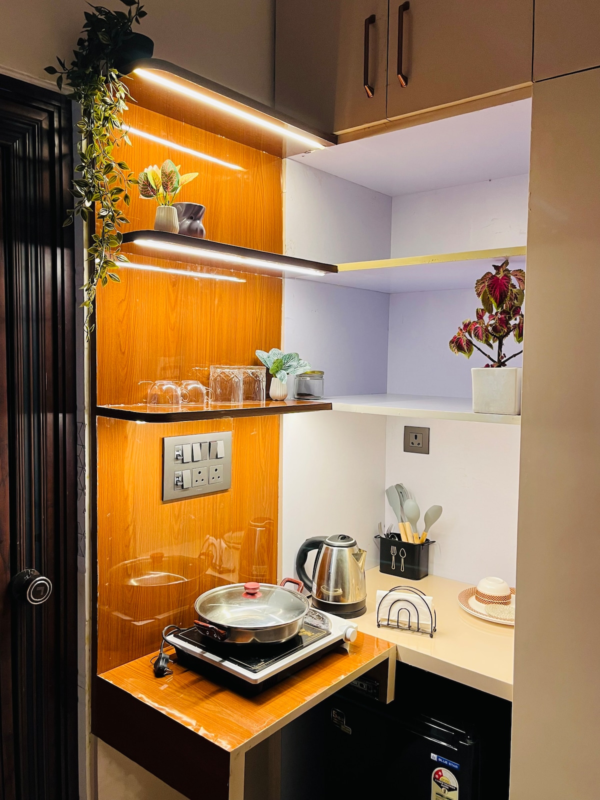 ➽ Amplio departamento de 1BHK con patio adjunto, totalmente climatizado. Todas las habitaciones tienen aire acondicionado de 1,5 toneladas. Propiedad ➽ orientada al sol en un vecindario de altos ingresos, abierta a tres lados, orientada al parque y bien ventilada con amplia luz natural y aire fresco. Proyector ➽ de alta gama con barra de sonido de 25W y Amazon FireStick con aplicaciones Ott. ➽ Cocina totalmente equipada con elementos esenciales para una cocina cómoda. ➽ Relájate en el impresionante patio con terraza privada con luces ambientales y un sistema único de Foger para enfriar el patio.