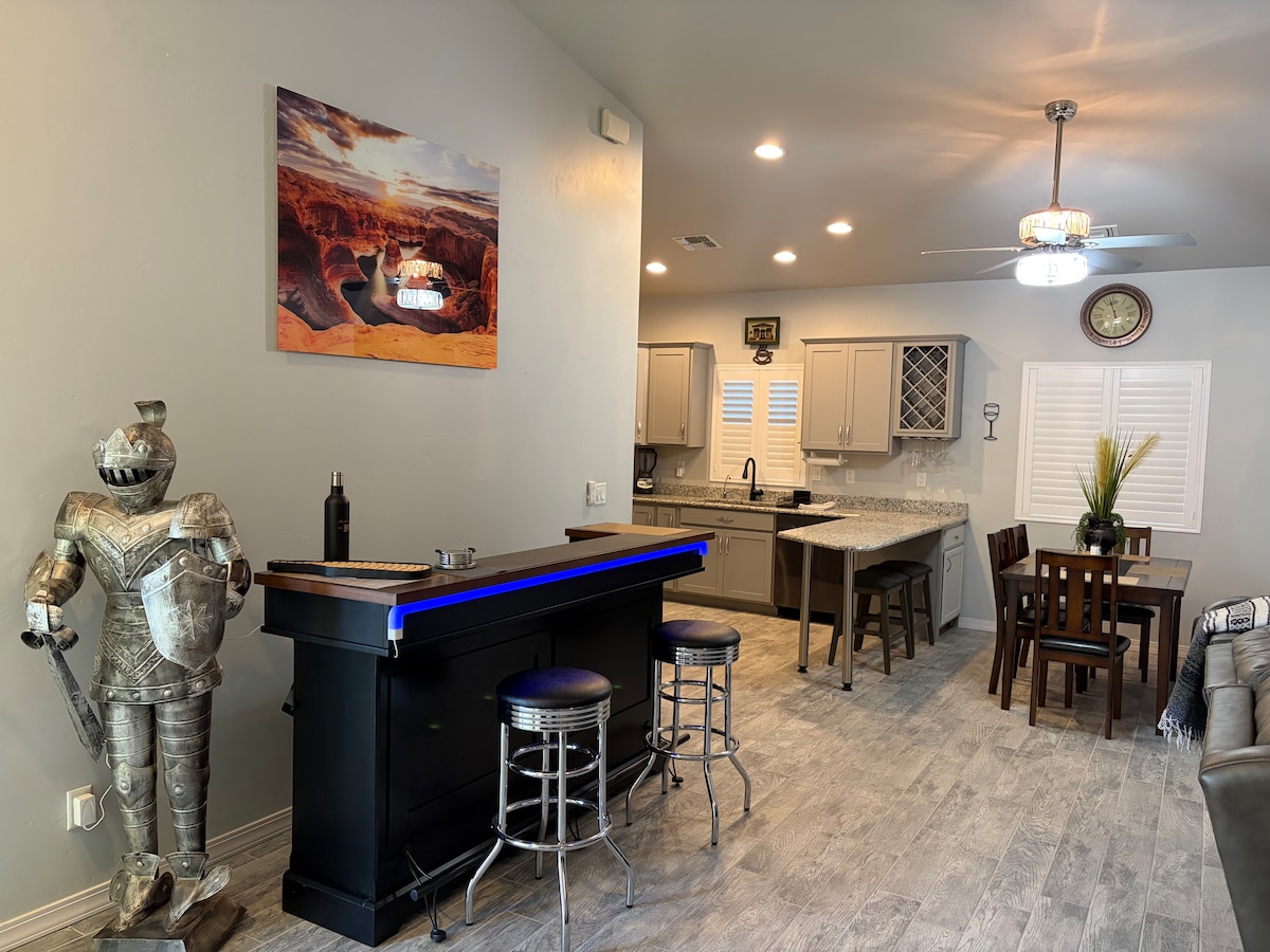 ¡CASA A ESTRENAR! ¡SE ADMITEN MASCOTAS! Esta casa de 1 dormitorio y 1 baño tiene capacidad para 4 personas y se encuentra en una ubicación perfecta a pocos minutos del centro médico regional, la I40, la Ruta 66 y el centro histórico de Kingman. La casa también está muy cerca de muchos restaurantes populares, campo de golf local e incluso Starbucks. Lo que separa esta casa de otras en la zona es que tienes tu propio patio, corral para perros, lavadora y secadora y todos los utensilios para comer y beber junto con una nevera de tamaño completo, barbacoa de gas al aire libre, Smart TV, etc.