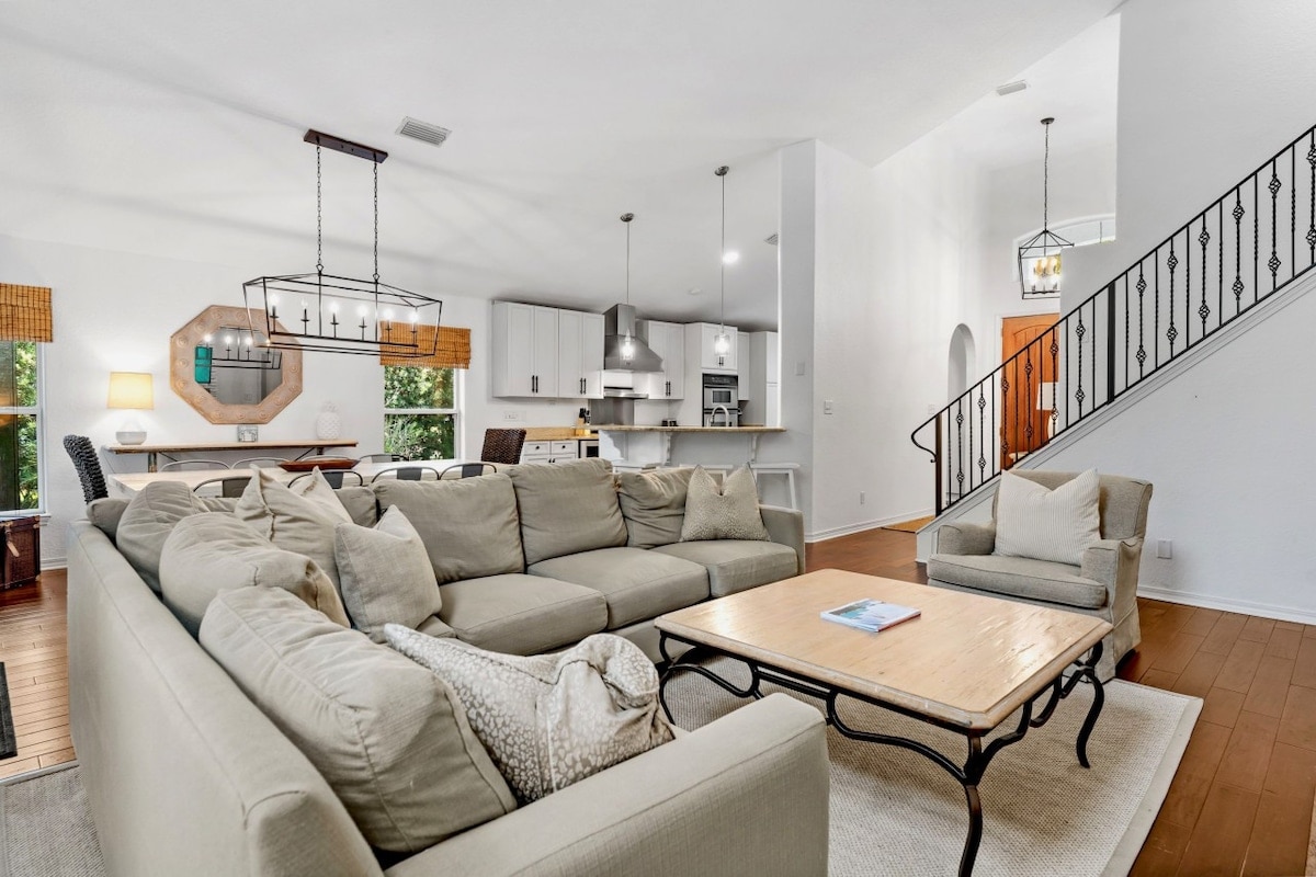 ¡Tu oasis de lujo te espera! Mientras caminas a través de nuestras puertas esmeralda batientes hacia el patio delantero, ¡las vacaciones de ensueño en la playa se hacen realidad! Nuestra impresionante villa de 5 dormitorios (incluida la cabaña de invitados recién renovada) se encuentra en el barrio privado de Destiny West, similar a un centro vacacional y valorado en varios millones de dólares, frente a la hermosa playa James Lee. Con espacio para alojar cómodamente hasta 14 huéspedes, ¡es perfecta para varias familias o para una escapada sencilla!