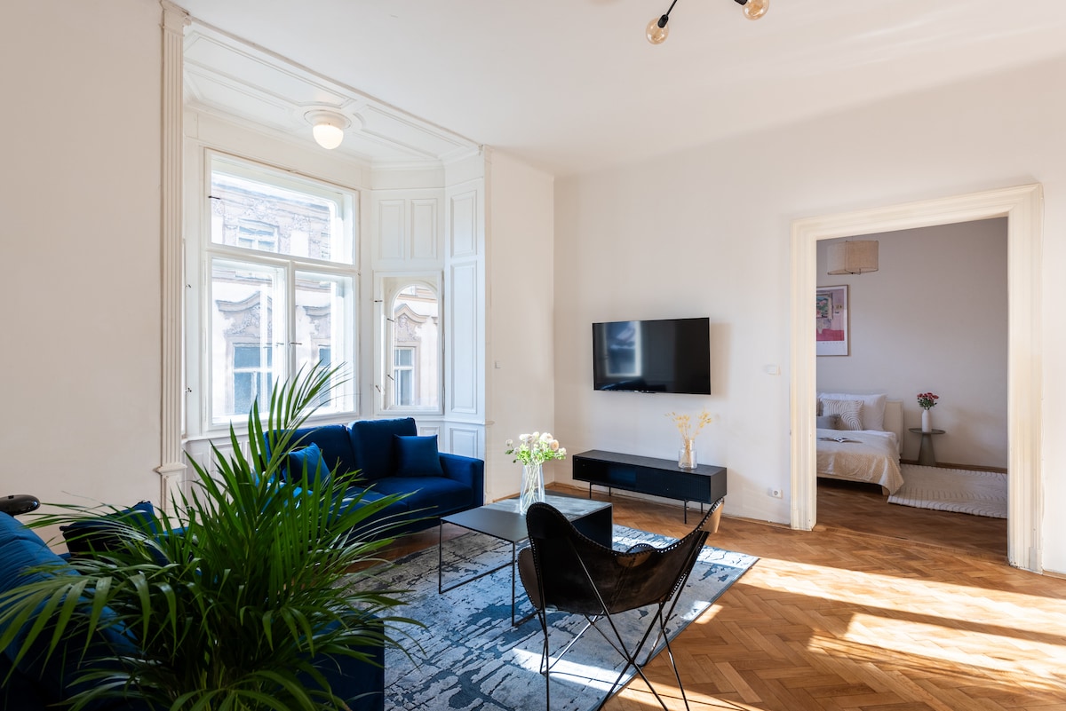 Disfruta de tu estancia en mi hermosa casa Jugent Stil construida en la década de 1890, pero recientemente renovada con todas las comodidades modernas que uno podría desear, incluido el aire acondicionado incorporado en todas las habitaciones. Apartamento de dos dormitorios bellamente decorado con techos altos históricos decorados con molduras de estuco ornamentadas, muebles de mediados de siglo y modernos en todas partes, baño con bañera grande y aseo separado. El lugar ideal para sentirse como en casa mientras estás en Praga, ya sea para un viaje de fin de semana, un viaje de negocios o estancias más largas.