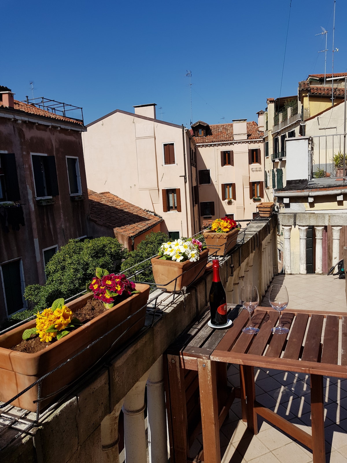 Acurrúcate con un libro, desayuna y cena mientras admiras la increíble vista de los campanarios y canales de Venecia, vive como un verdadero veneciano en el barrio más típico de Venecia a pocos pasos del puente de Rialto, Ca' D'oro y San Marco en un apartamento acabado con muebles y adornos hechos por artesanos venecianos y de Murano. Te sentirás como si estuvieras experimentando el fantástico ambiente de los años 1800, pero con todas las comodidades de un apartamento moderno. No te pierdas esta increíble experiencia.