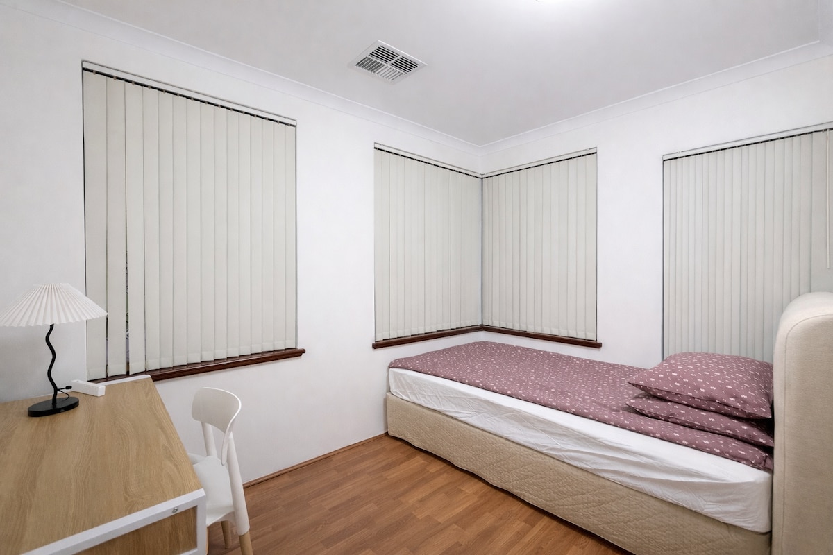Disfrutá de una estadía tranquila en una habitación limpia y acogedora en el corazón de Willetton. La casa se encuentra en un callejón sin salida tranquilo, a pocos minutos de la escuela secundaria Willetton, del centro comercial Southlands y del transporte público que va a la ciudad de Perth. Los huéspedes comparten una cocina moderna, un comedor y un lavadero. La habitación cuenta con una cama cómoda, un escritorio y un armario: es perfecta para estudiantes, profesionales o viajeros que buscan una estadía tranquila y práctica.