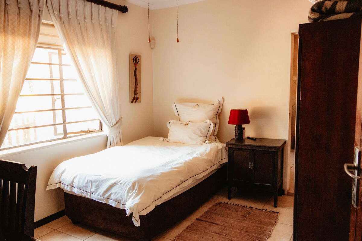 Encantadora suite de invitados totalmente equipada, tiene energía solar, que proporciona alojamiento para 1 - 5. Área braai privada, garaje privado seguro y gran piscina. Ubicado en el centro entre el Aeropuerto Internacional O.R. Tambo (18 km) y Sandton CBD (20 minutos). A 16 minutos de JHB CBD, a 7,5 km del aeropuerto Rand. Situado a 3,9 km del Bedford Centre y a 4,9 km del centro comercial Eastgate. Diversos entretenimientos a corta distancia. Disfruta de un desayuno continental independiente incluido todos los días.