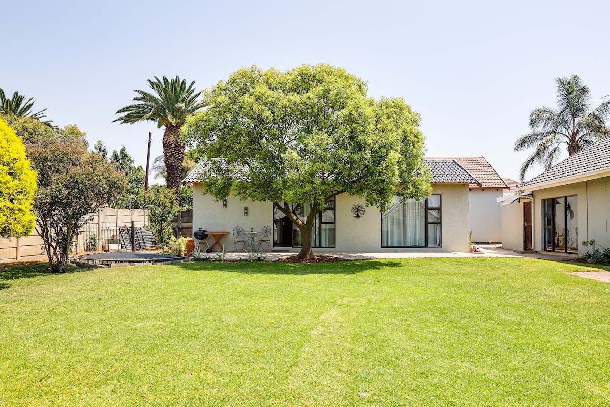 Bienvenido a tu tranquilo hogar lejos del hogar, en el hermoso, verde y seguro entorno de Thornhill Estate. Disfruta de la comodidad del acceso controlado a la finca, patrullas de seguridad las 24 horas y un ambiente tranquilo y residencial. Esta elegante casa de huéspedes de 2 dormitorios y 1 baño (solo ducha) ofrece la escapada familiar perfecta. A solo 10–15 minutos del Aeropuerto Internacional OR Tambo, a 5 minutos a pie del centro comercial Flamingo. Campos de golf cercanos, canchas de pádel, reserva natural y tiendas locales para la naturaleza y lei