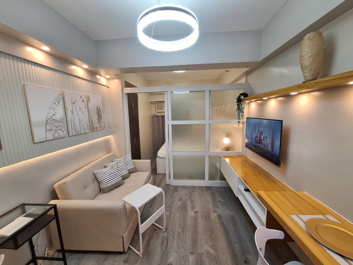 Fully Furnished Studio Type with Balcony, the unit faces city view but there is a designated viewing deck on 24th floor. Breath taking Panorama view of Taal Volcano and Jogging Path on 24th flr. Roof Deck Full Kitchen (Microwave , Ref, Kitchenwares and Induction Cooker) Water is filtered by Megafresh so no need to buy drinking water outside. Water purifier has been provided with no guarantee of 100% pure safe. It is still advisable to purchase bottled water if necessary.