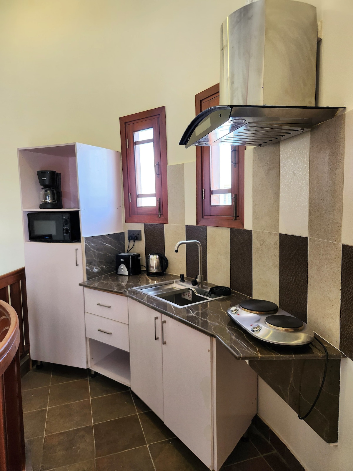 Este tranquilo estudio del tercer piso ofrece impresionantes vistas a la playa desde la azotea. Ubicado en un callejón tranquilo junto a una concurrida zona comercial, disfrutarás de un sueño reparador mientras estarás a pocos pasos de Clifton Beach, Dolmen Mall y excelentes opciones gastronómicas. Una acogedora cafetería de estilo japonés está abajo, y una calle bulliciosa cerca ofrece muchas opciones gastronómicas. ¡Perfecto para aquellos que buscan comodidad, comodidad y una estancia relajante con fácil acceso a todo lo que necesitas!