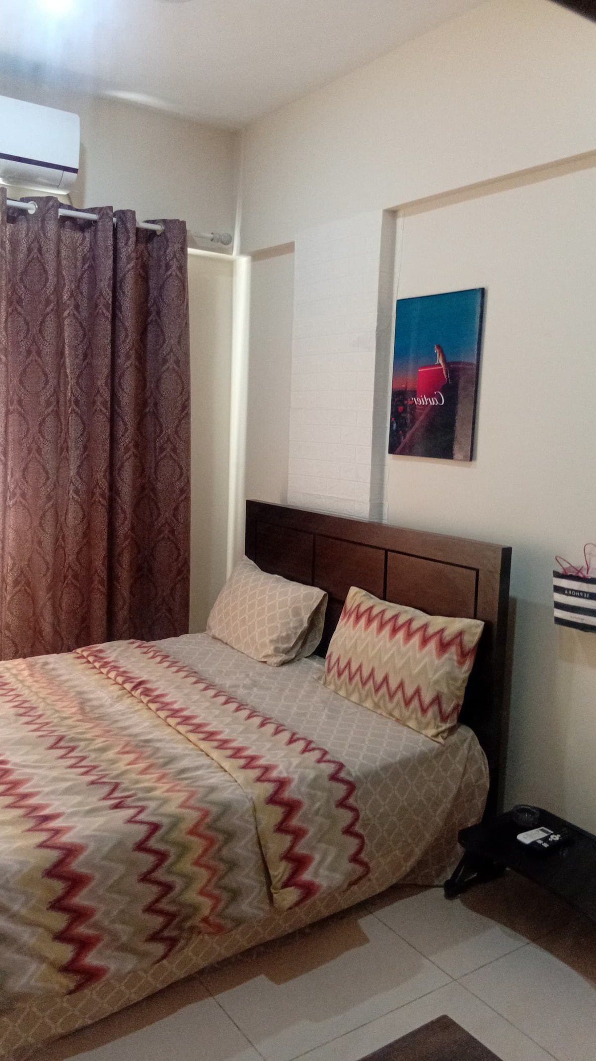 Entire Apartment with AC, WiFi, and Smart LED TV Your private, secure oasis awaits! This cozy, fully furnished apt is perfect for a peaceful getaway. Featuring a spacious bedroom with a king-size bed, wardrobe, dressing mirror, and Android LED TV, The attached bathroom includes a commode, shower, and wash basin, enough for a relaxing stay The kitchen is equipped with a refrigerator, microwave, and a dining space for two, making it easy to enjoy home-cooked meals. A second room with a small bed