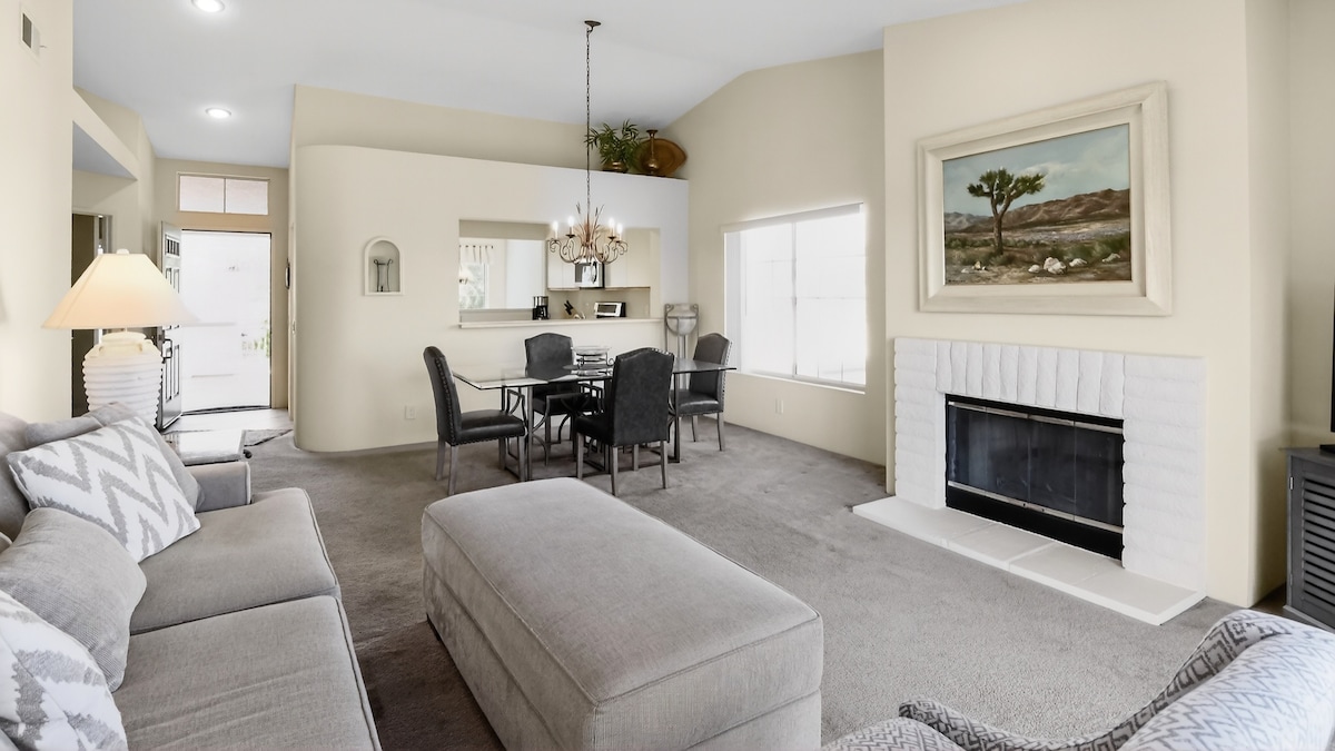 Bienvenido a tu escapada audaz y alegre en Palm Desert, una villa elegante de 2 dormitorios y 2 baños diseñada para la relajación, la creatividad y la comodidad. Con un estilo de mediados de siglo, toques boho y una decoración colorida, este refugio lleno de sol es perfecto para parejas, familias, amantes de la nieve y trabajadores remotos. Disfrutá de servicios de resort, vistas al campo de golf y una vibrante vida interior y exterior, todo en una comunidad tranquila y cerrada a minutos de El Paseo e Indian Wells.