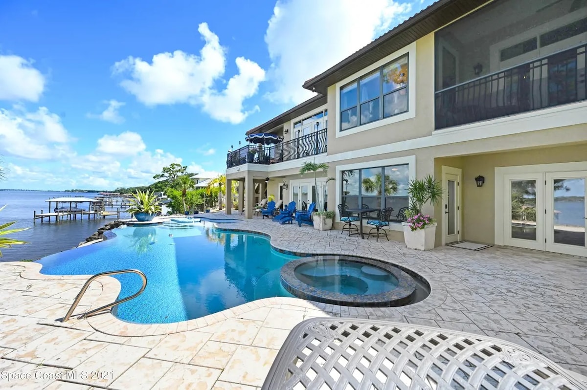 Spacious Home on the Banana River, screened heated pool, riverfront dock, tiki bar and hot tub. Kayaks to explore the mangrove islands, bikes to explore Cocoa Beach. Manatees, dolphins and Florida wildlife are on full display from our private dock Space Launches are visible from the dock. Three King bedrooms with direct pool access and a fourth room with 2 bunks (4 single beds) and a King Bed, provides many options for family sleeping arrangements. 1 hour to Disney/Universal