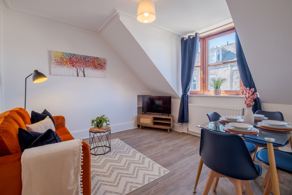 Recently renovated, our one bedroomed apartment is located a mere 10 minute walk from Aberdeen city centre along George street, a popular area with many unique shops. Spacious double bedroom with king size bed, 50" TV, wardrobes, chest of drawers, dressing table and floor standing full length mirror. Semi-open plan kitchen/lounge with ample seating, breakfast area and smart TV. Bathroom with luxury rainfall shower over bath. Bus stop 2 mins walk and free on street parking.