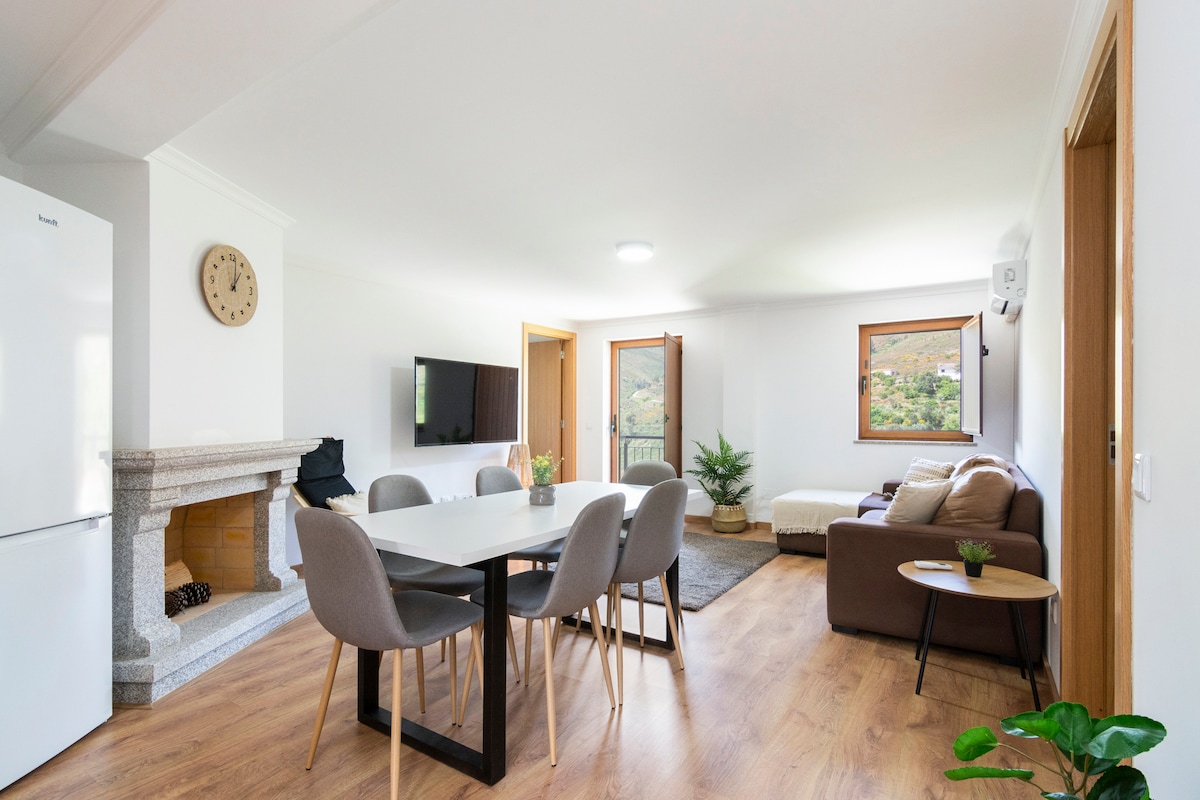 Apartment with patio and independent entrance that is part of a villa inserted in the village of Vide in the heart of Serra da Estrela close to the best known areas such as Piodão, Foz D'égua, Poço da Broca and with several river beaches close by. It has 2 bedrooms, one with a queen bed and the other with a single bed. A fifth person can sleep on the sofa bed in the living room. Fully equipped kitchen and BBQ with a dining patio at the side of the house with beautiful views over the mountains.