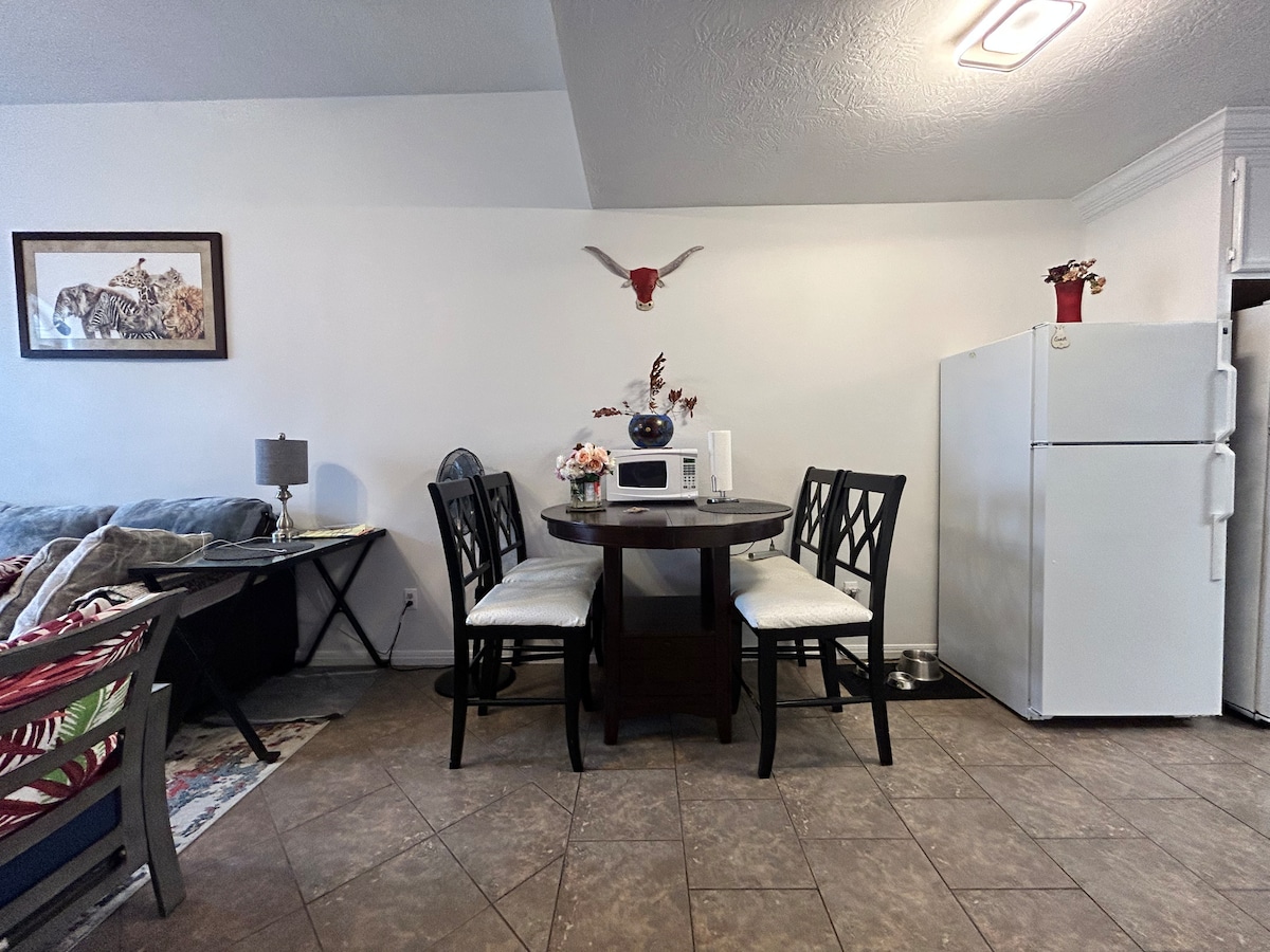Relájate en una nueva casa adosada «Boho Modern» ubicada en el centro histórico de Bryan y a poca distancia a pie de Ronin, Black Water Draw, RX Pizza, The Village, Cilantro, el mercado de agricultores y muchos más restaurantes. Ambos dormitorios tienen camas tamaño king y la habitación principal/sala de estar tienen televisores de 50 pulgadas. Inicia sesión en tu cuenta personal de streaming o utiliza nuestro Hulu, Disney+ o ESPN+, como cortesía. Relájate en el patio trasero privado o cocina en la hermosa cocina que incluye una cafetera Keurig con cápsulas y cremas.