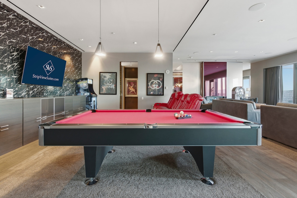 Experience elevated luxury in this 3,300 sq ft designer penthouse created for comfort and refined entertaining. The residence features two bedrooms, two spa-style bathrooms, a statement dining room, pool and poker tables, plush movie-style seating. Floor-to-ceiling windows frame sweeping city views, while guests enjoy 24/7 StripViewSuites support and access to resort amenities including spa, gym, valet, and concierge. (Pool open seasonally, April–September.) JACUZZI IS UNAVAILABLE.