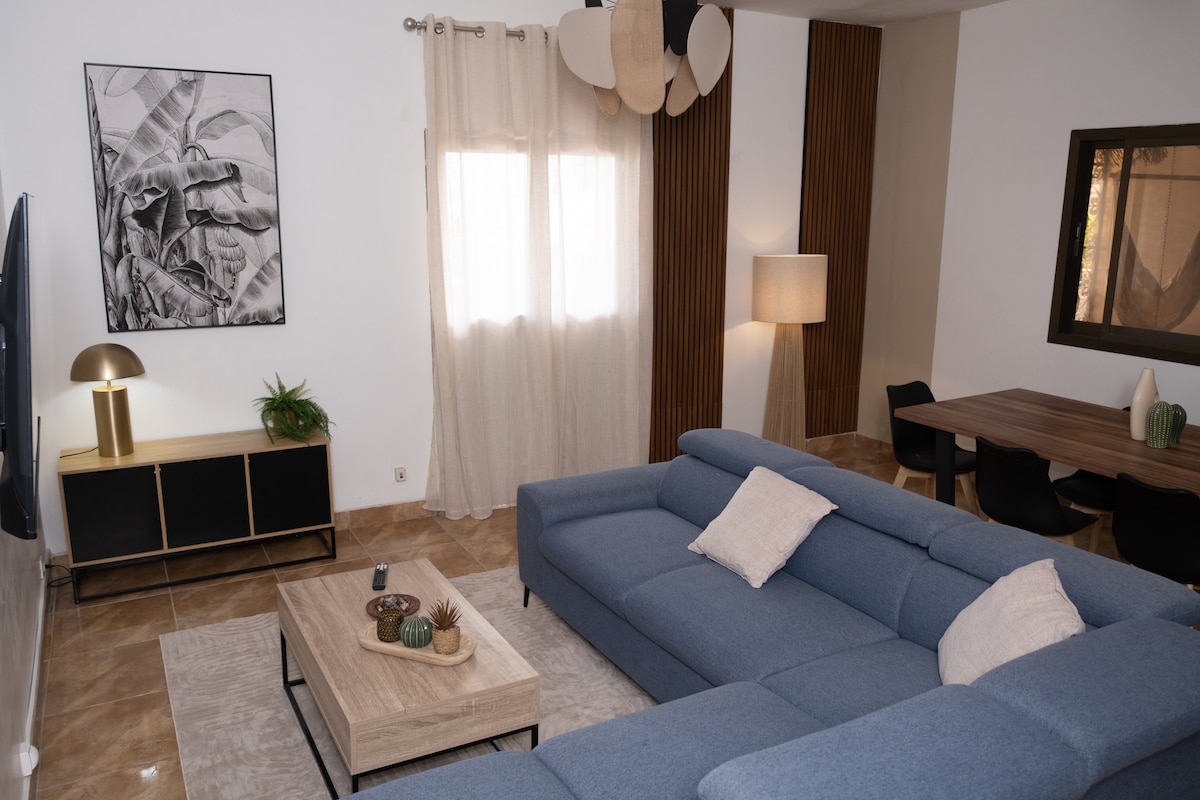Ce T4 bohème chic est situé à Petite-Terre, dans une résidence sécurisée dédiée à la location saisonnière, équipé d'une CITERNE. Entièrement décoré par un architecte, il offre un salon spacieux avec canapé XXL, un patio privé, trois chambres thématiques (Azur, Sauge, Terracotta) et un coin bureau idéal pour le télétravail. Géré par la conciergerie Nawassi, le logement garantit confort, sérénité et un accompagnement professionnel tout au long de votre séjour.