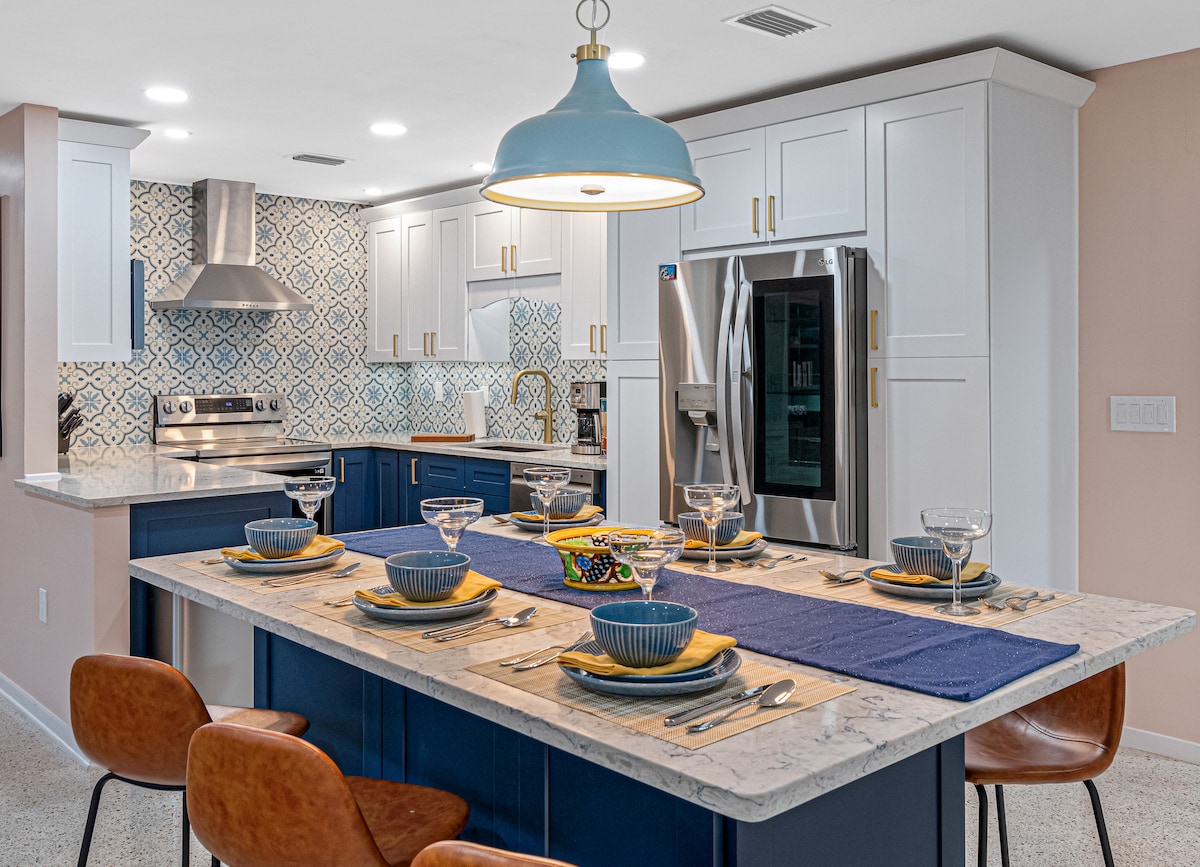Fantastic fully renovated 3BR 2BA house in Seminole, 3 miles from Indian Shores Beach, short drive to world class beaches of Madeira, North Redington and Clearwater. Private backyard with solar heated pool, outdoor kitchen and dining space, or have a movie night on 86 inch flat screen TV in the luxurious living room. Gourmet kitchen with large quartz dining island perfect for entertaining, house walking distance to Seminole City Center with SMG Theater, Publix and Pinellas Trail. Sleeps 8.