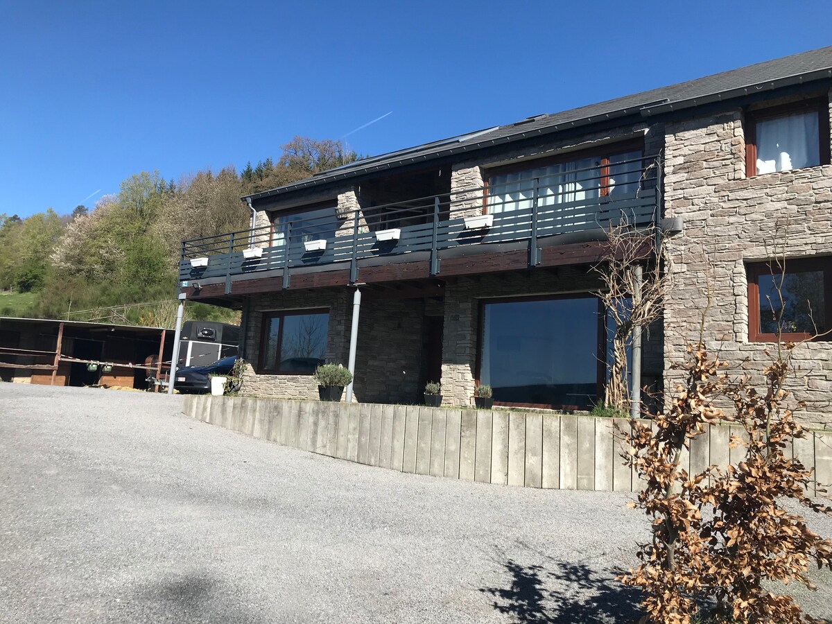 Maison en pierres (ancienne ferme restaurée) avec une vue exceptionnelle sur la vallée. La maison est très confortable, bien équipée avec son grand feu ouvert réconfortant pour les longues soirées d'hiver. Située dans un petit village en cul de sac, très calme et à 10 mètres des bois et de départs jolies balades balisées. Un bon bol d'air pur au coeur de la nature avec une multitude d'activités à proximité : randonnée, VTT, Hautes Fagnes, thermes de Spa, Golf, Circuit de Francorchamps, ...