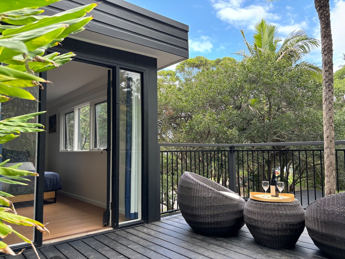 An award winning small house at the beach end of Crystal Avenue. Ideal for a couple or a small family; pets are welcome too. In its own rainforest (unfenced) garden, set back from the street and neighbours and hidden from the main house 50m behind it, it’s private and quiet. All you’ll hear are the birds and the surf. Inside you’ll find open-plan living, a cosy bedroom overlooking the garden, plus an open loft second bedroom with its own balcony.