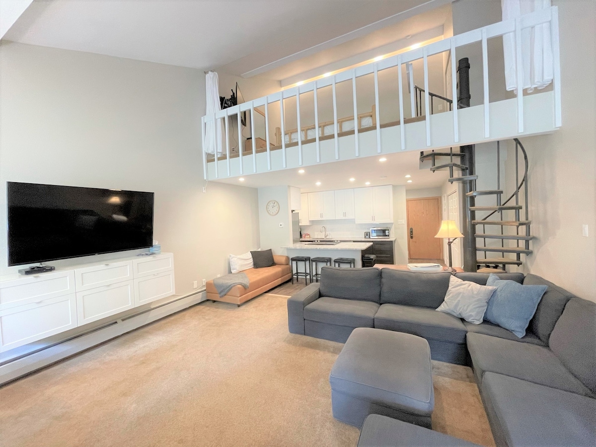 Updated slope-side condo in Center Village with views of the American Eagle lift. True ski-in/ski-out with on-site parking, elevator access, and a slope-side ski locker. Sleeps 6 with 6 beds: loft king, Cal king window bed, convertible leather daybed (two twin XLs), plus two twin floor mattresses. Sunny south-facing dining nook, vaulted ceilings, and a cozy gas fireplace. Please note: loft is open and accessed via a spiral staircase.