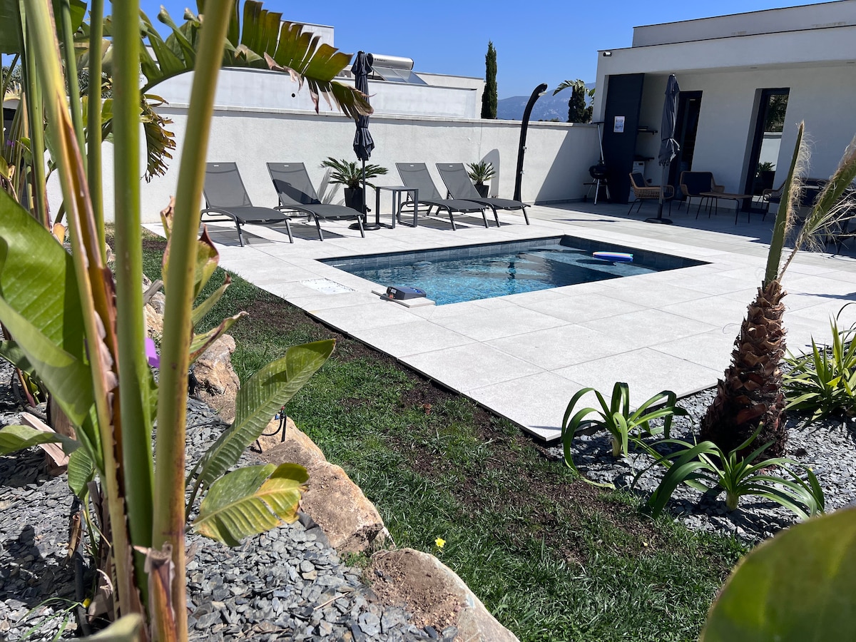 Villa nueva y contemporánea en L'Île-Rousse para 6-7 personas. 3 habitaciones. Gran terraza con vistas excepcionales al mar (frente a la puesta de sol), tranquila, muebles de diseño de lujo y villa con todas las comodidades (aire acondicionado, wifi, cocina equipada, sábanas y toallas, estación de carga eléctrica, plancha, etc.), a pocos minutos de la playa, el centro de la ciudad y las tiendas. Segunda terraza en el lado de la tierra para refugiarse de las horas más calurosas del día.