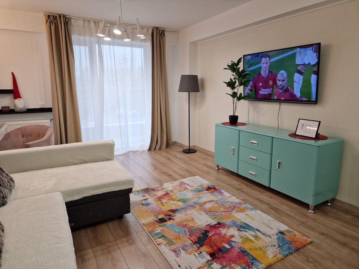 Un maravilloso apartamento de 2 habitaciones junto al aeropuerto (a 10-15 minutos a pie, o en taxi 3-5 minutos, en tren 2 minutos) en un entorno tranquilo rodeado de árboles, césped verde, zona de barbacoa, parque infantil y una piscina disponible en verano. Tren directo al centro de Bucarest (20 min). En el precioso apartamento tienes todo lo necesario para sentirte como en casa. La principal atracción de la zona es el mayor balneario termal europeo Therme, así como centros comerciales, el famoso Museo del Automóvil Tiriac, lagos y bosques.