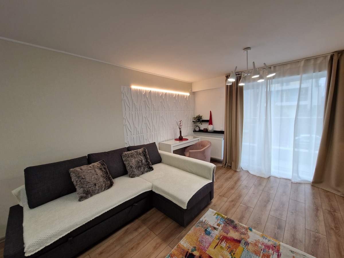 High-class, intimate apartment situated at 2nd level of a newly built villa, having 2 large bedrooms, 1 youth bedroom having 2 single beds (90 x 200cm), 2 bathrooms, kitchen, 4-6 persons dinning table, WiFi, access to computer and printer. Can accomodate up to 6adults (or combination adult/kids) . COVID 19: The entire property complies with the necessary cleaning and disinfection rules during the Covid19 pandemic. All surfaces are disinfected with professional solutions.