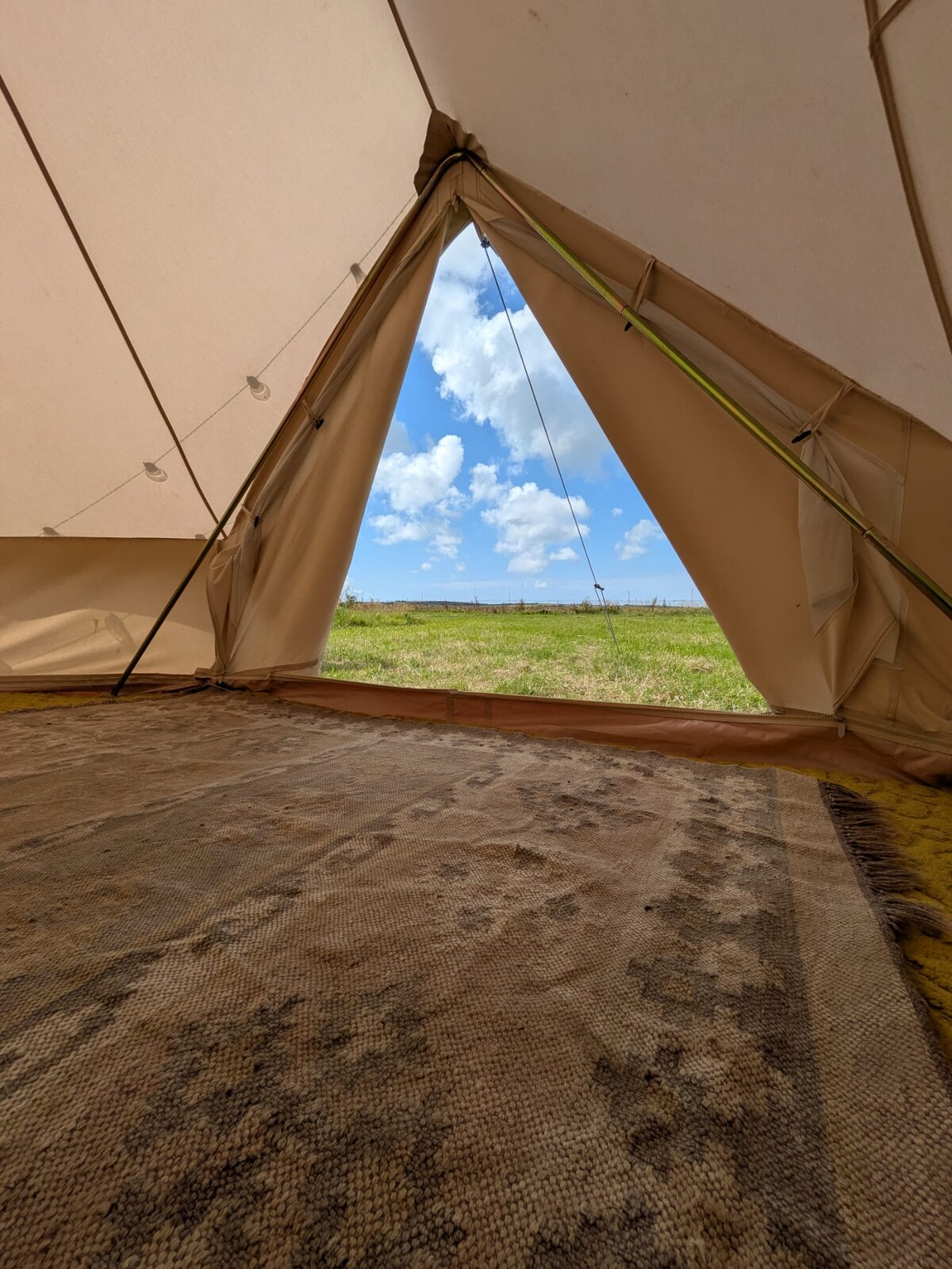 Vuelve a conectar con la naturaleza en esta escapada inolvidable. Una tienda de campaña preestablecida de 5 metros con hermosas vistas rurales. Con una chimenea natural y un baño al aire libre, podrás relajarte en un baño caliente de agua dulce de manantial y luego acurrucarte junto a un fuego de leña bajo las estrellas. A poca distancia en auto de muchas playas/paseos. Hay un inodoro compartido, ducha e instalaciones de lavado. Se proporcionan mesa baja, cama matrimonial desnuda y sofá pequeño. Por favor, trae tu propia ropa de cama/sacos de dormir y alfombrillas adicionales si es necesario😊.