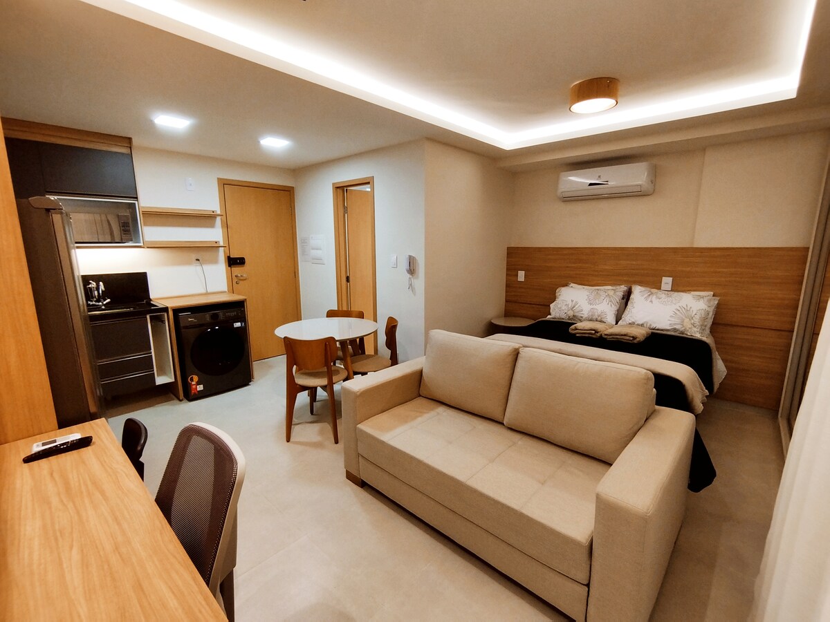 Apartamento tipo estudio súper confortable con una ubicación inmejorable para sus compromisos laborales y/o de ocio. ► Cama doble con colchón de muelles; ► Smart Tv 40” (incluye Netflix, Prime Video, Disney+ y Globoplay); ► Aire acondicionado; ► Ventilador turbo; ► Persiana tipo blackout; ► Armario con perchas; ► Altavoz bluetooth; ► Mesa de estudio/trabajo con lámpara; ► Sofá cama para parejas; ► Mesa de alimentación; ► Cocina equipada para preparar comidas sencillas.