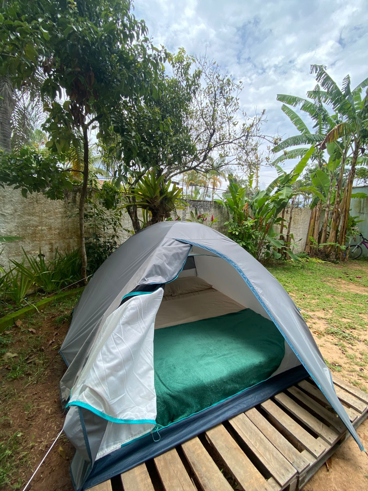 Acomodação em barraca Quechua, colchão densidade 20, banheiro privativo com chuveiro elétrico, pontos de luz, iluminação, wi-fi, churrasqueira, casinha na arvore, cama elástica, estrutura para fogueira, cozinha com fogão de lenha, animais, piscina, horta, local seguro com uma vista incrível ao redor de uma mata nativa!