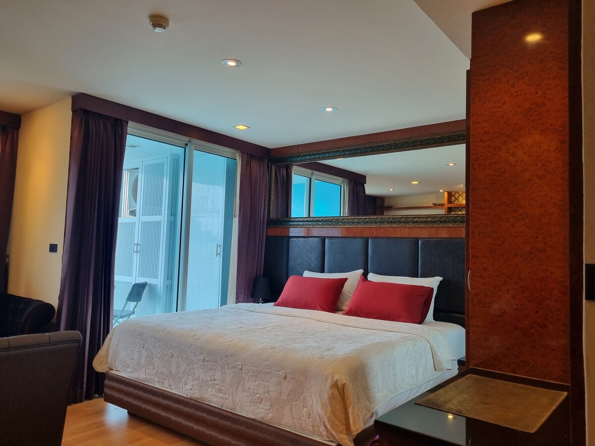 Piso 40 Estudio de 26 metros cuadrados (cama tamaño king), con excelentes vistas al mar. Nuestra habitación está en el condominio Unixx. - A 2 minutos a pie de calles concurridas para disfrutar de la sabrosa comida local. - A 7 minutos a pie del muelle principal y la pista de karts. - A 10 minutos de la calle peatonal. - A 20 minutos a pie de la playa. - 2 piscinas/sauna/gimnasio. - Gran vista en el jardín del cielo. - A 31 km del Aeropuerto Internacional U-Tapao Rayong-Pattaya.