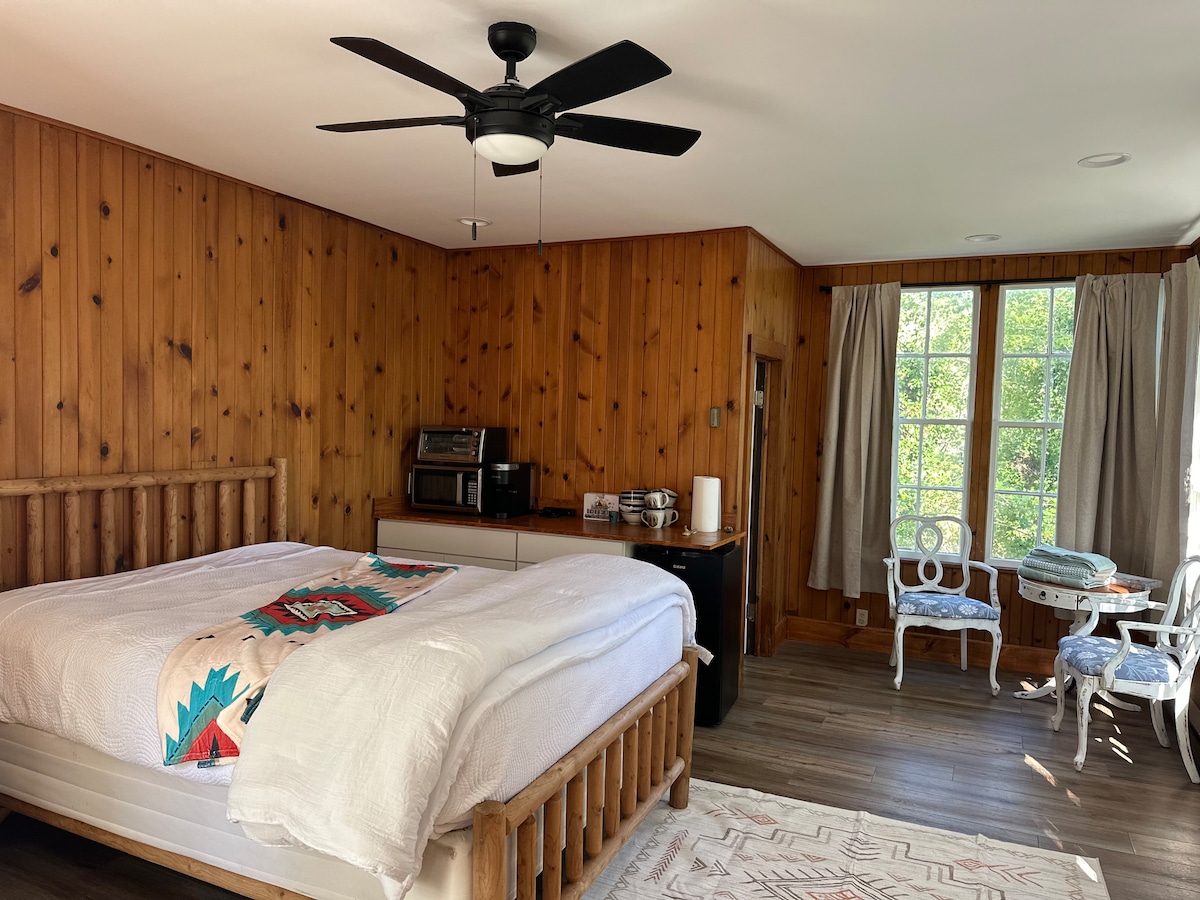 A comfy loft suite for your getaway. Private entrance and deck. Kitchenette -wood countertop, refrigerator under the counter. Microwave, toaster oven, sandwich grill, coffee maker, some dishes/pans. No range. Spiral stairs. The bathroom is open, but around the corner from living space, has a privacy curtain. Tiny Space with a great big view! Right on the Warm Spring! Go down the hill and right in the spring, warm year round. May Not be suitable for older adults, READ on.