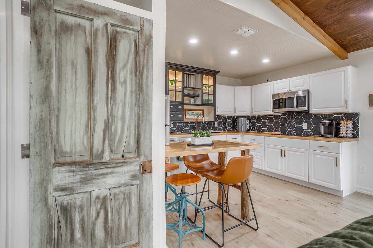 Esta encantadora casita de campo es de nueva construcción, diseñada en el estilo «industrial farmhouse chic». Es el lugar perfecto para una escapada romántica o una relajante aventura en el campo. ¡Disfruta de las vistas arboladas desde el porche trasero, camina hasta el lago o disfruta de un día en el centro de Granbury! Si tienes suerte, puede que incluso veas al correcaminos del barrio. ¡Le encanta usar nuestro porche trasero como escondite!Nos encantaría tenerte, así que ven y quédate un tiempo.
