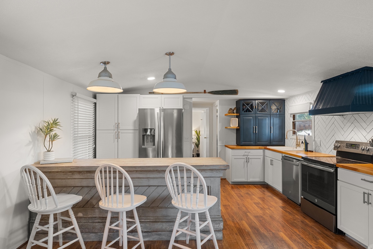 Nuestro encantador lugar está enclavado en un canal que ofrece kayak tranquilo o pesca. Con una rampa para botes a 5 casas de distancia, puedes botar tus botes con facilidad y amarrarlos en nuestro muelle. Hemos amarrado un barco y dos motos acuáticas con espacio de sobra. Tenemos un montón de juegos de mesa y una chimenea al aire libre para mantener la diversión hasta la noche. Nuestra casa ofrece tres dormitorios. El principal cuenta con una bañera de hidromasaje para relajarse.