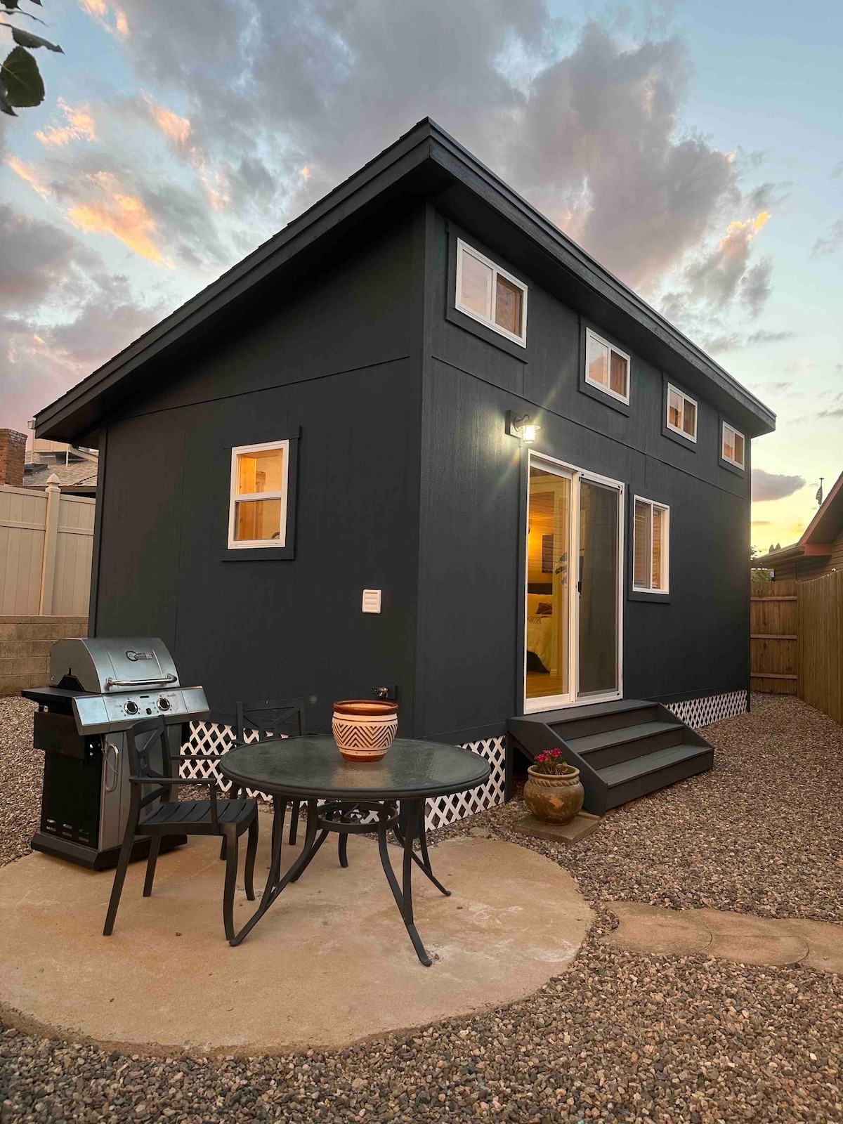 Hecha desde cero, es una casa pequeña a estrenar con un acento único, techos de pino y electrodomésticos nuevos. La acogedora y memorable casa cuenta con una cama de matrimonio en la primera planta. TOTALMENTE AMUEBLADA. El baño está decorado con azulejos florales de cascada y un lavabo que se encuentra en el centro de Prescott. ¡Esta pequeña casa está especialmente hecha con AMOR por un artista! La puerta corrediza de cristal tiene vistas a la montaña Mingus. La ubicación es céntrica en la ciudad de Prescott Valley, Sedona (1 hora), Phoenix (1,5)