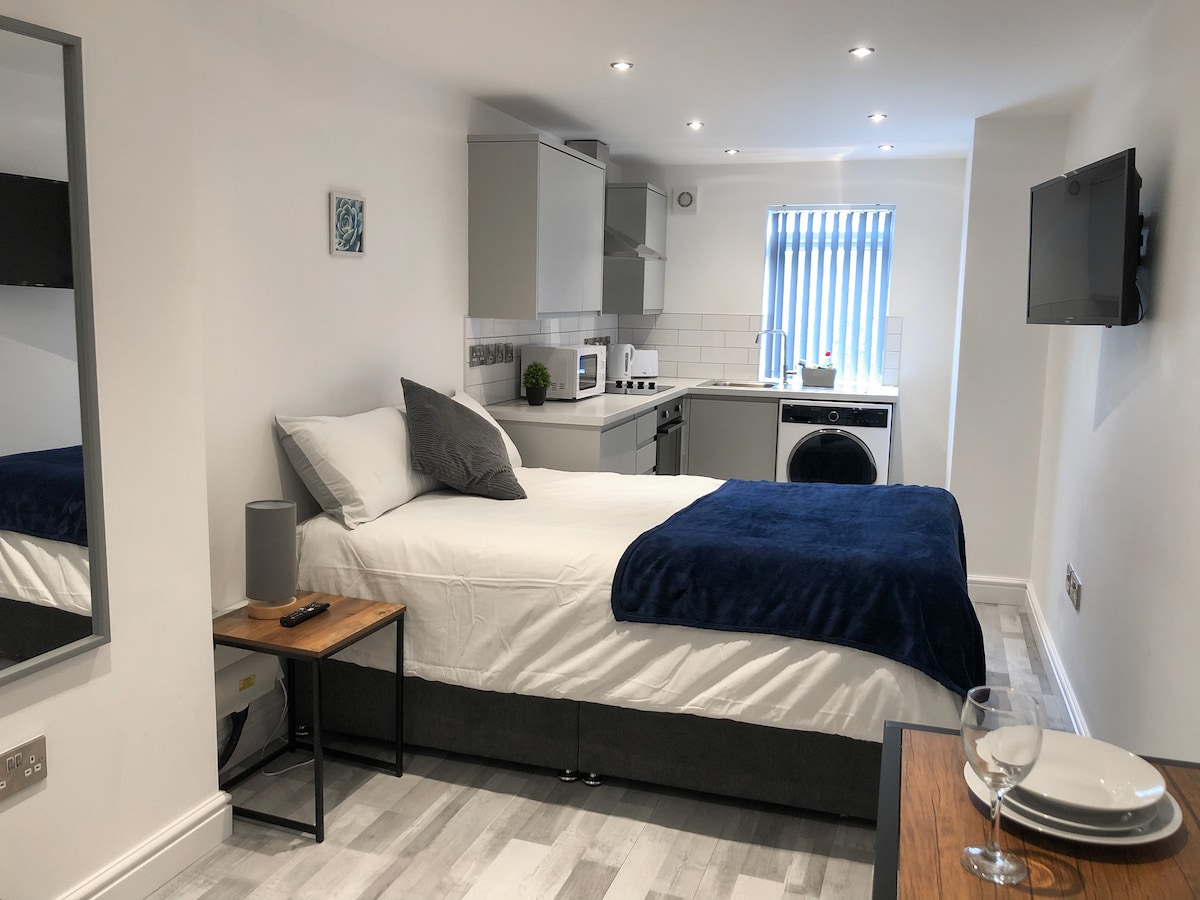 ¡A solo 8 minutos en auto del centro de Manchester! Un estudio de alta especificación diseñado para albergar a viajeros de placer y de trabajo. Con camas zip-link de calidad del hotel con capacidad para dos personas (nota: cama de tres cuartos). El espacio cuenta con TV y wifi GRATUITO, cocina totalmente equipada con lavadora y nevera incorporada. Un moderno baño privado con ducha a ras de suelo. Comedor; perfecto para aquellos que viajan por motivos de trabajo. Estacionamiento GRATUITO en la calle.
