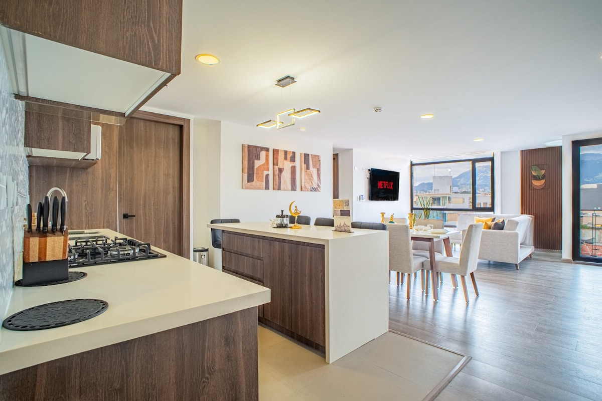 Ubicada en el exclusivo edificio TERRAZZA, cerca de áreas verdes y recreativas. A solo 5 minutos en auto del centro histórico y zonas comerciales. Disfruta una estadía de lujo en esta moderna suite con dos balcones privados: uno con vista a las montañas y otro al parque. Cuenta con un baño completo y uno social, cocina equipada, sala acogedora, dormitorio elegante, parqueadero privado, acceso gratuito al gimnasio y seguridad 24/7.