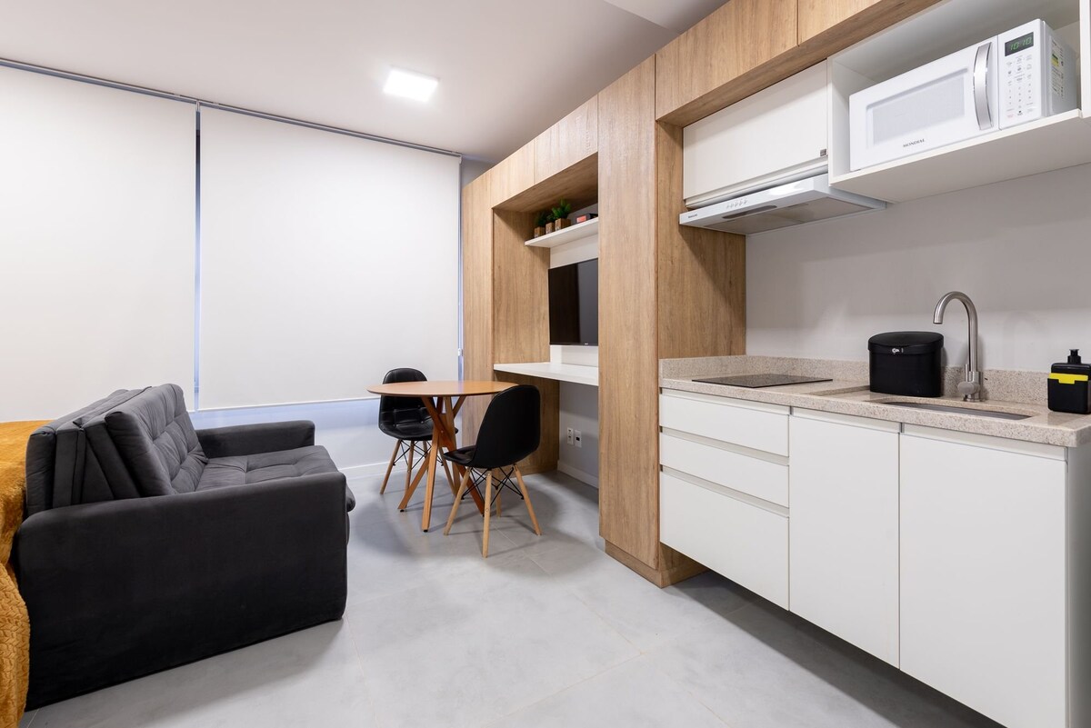 Departamento con decoración moderna y acogedora y muebles nuevos. Estudio con cama doble tamaño queen, baño completo, TV inteligente y aire acondicionado. ¡Taza completa con nevera, equipo nuevo y funcional! Afortunadamente, tenemos 2 estacionamientos junto al edificio a menos de 50 metros de distancia en la misma acera. Diariamente entre 35 y 60 reales.