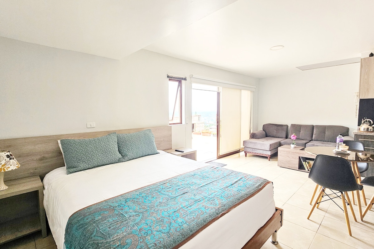 Alojamientocon 1 cama + 1 sofa cama, ideal para descansar unos días en Quito hasta emprender viaje hacia tu nuevo destino. A 500 metros de distancia de la estación del metro.