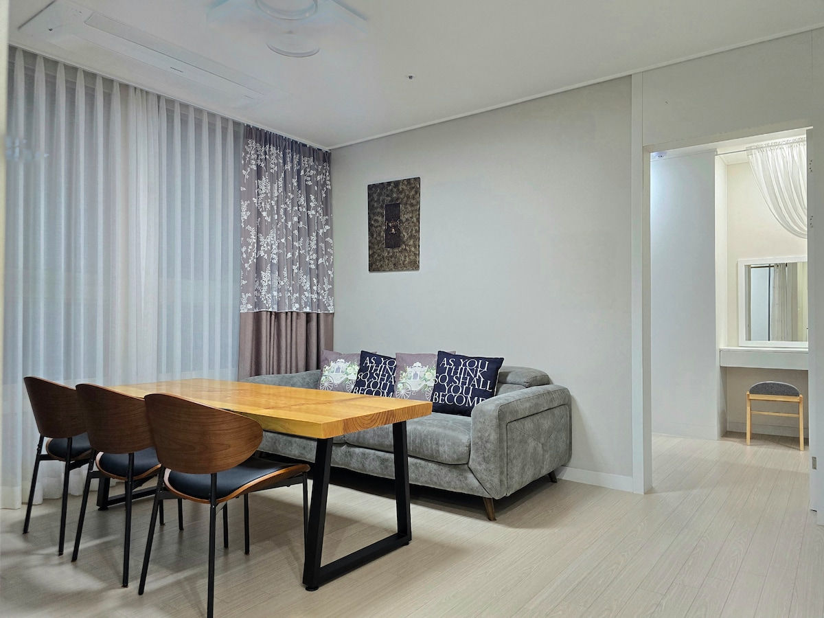 Relájate con toda la familia en este tranquilo refugio. Estadio de béisbol Daejeon (a 5 minutos a pie), Catedral del Sagrado Corazón (a 7 minutos en auto) Bomunsan (Acuario Daejeon a 5 minutos en auto), Estación de Daejeon (a 9 minutos en coche) Ubicado y Cerca, el Observatorio Sikjangsan, el Hospital Nacional de la Universidad de Chungnam, Hay O World en Daejeon. Nuestra casa tiene 2 habitaciones, Hay dos colchones queen. Nuestra ocupación predeterminada es 2. (Es un espacio adecuado para que se alojen 4 personas). Se proporciona una mesa de comedor y sillas para que 5 personas coman cómodamente. Solo se puede utilizar un dormitorio (cama queen) para 2 personas. Otro dormitorio está disponible para 3-4 personas. Se proporcionan toppers y ropa de cama (1 persona) para 5 personas. * Depósito de equipaje disponible antes de entrar en la habitación. * También es posible hacer el check-in después de la hora establecida. (Contraseña proporcionada por adelantado)