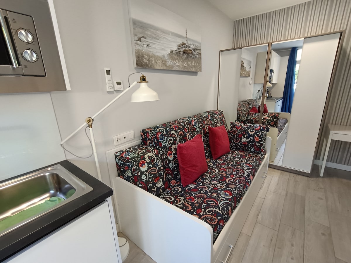 Nuestro apartamento cuenta con una habitación con cama matrimonial aire acondicionado y con un pequeño balcón,en el salón hay una sofá que se hace cama de matrimonio, cocina integrada al salón,el salon tiene TV Smartv 50 pulgadas con Netflix y wifi y aíre acondicionado,todas las estancias con luz natural,en el salón con una ventana al igual que en el baño,el apartamento está totalmente equipado y con todos los servicios,está recién reformado y todo nuevo para disfrutar de una escelente estancia.
