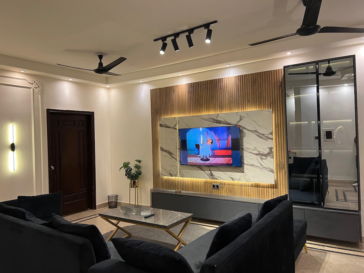 Moderno, lujoso y estético penthouse en DHA Fase 2 Islamabad. Diseño industrial con patio jardín, check-in automático, TV inteligente con Netflix incluida, wifi rápido, cocina totalmente equipada (cocina, microondas, nevera, hervidor, utensilios y cubiertos), baño abastecido y colchones de repuesto, jardín privado en la azotea con asientos, vistas impresionantes. Ubicación privilegiada cerca de parques, centros comerciales, restaurantes, cafés, a solo 2 minutos en auto de Central Park, a 5 minutos de Giga Mall, a 12 minutos de Bahria Town (todas las fases) y a 1 hora del aeropuerto.