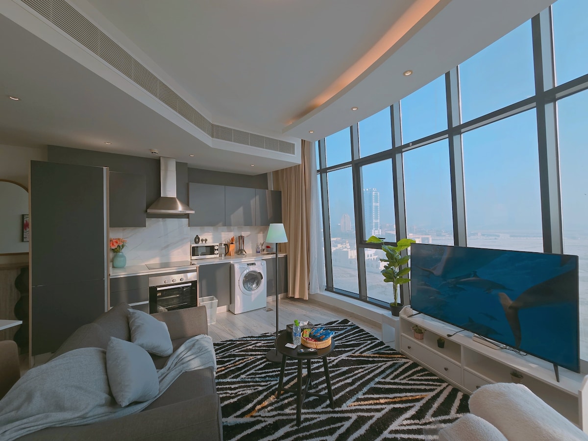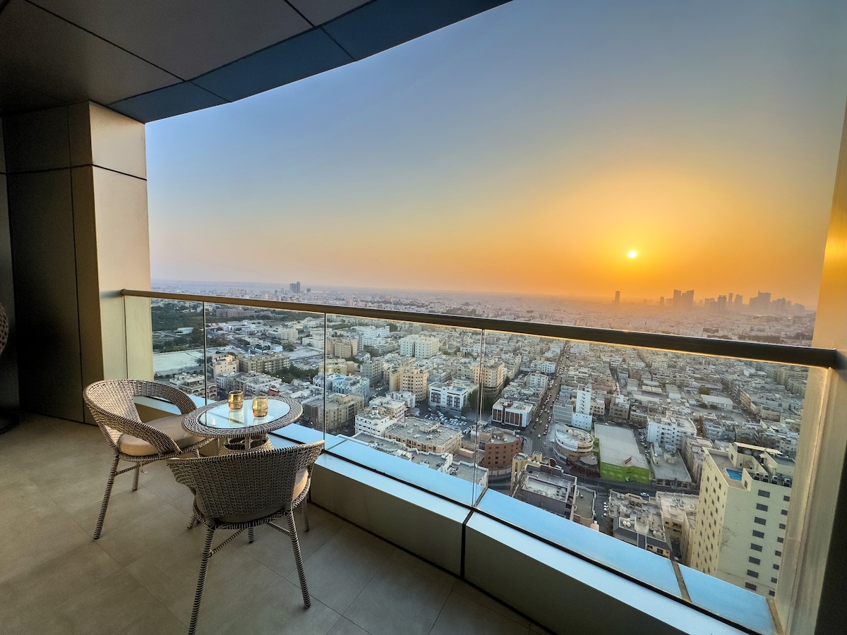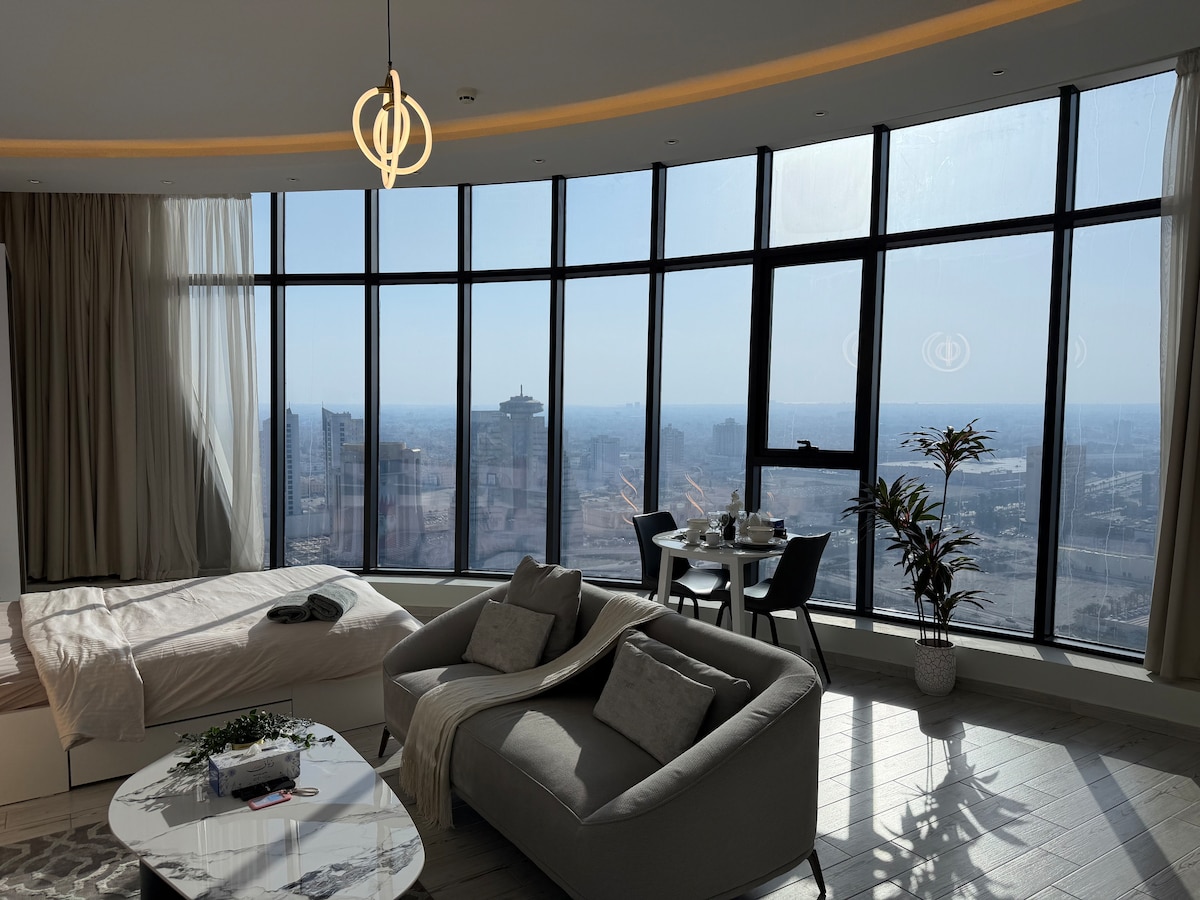 Wake up to breathtaking sunsets and skyline views. Located on the 35th floor, this cozy and modern apartment combines warmth, style, and comfort with beautifully designed interiors and thoughtful touches. Located in the city of Manama, this modern space is less than 15 min from exploring the city’s vibrant culture, markets, waterfront cafés, cultural attractions, top restaurants, and lively nightlife. The apartment is above the noise of the city, and is perfect for a peaceful escape!