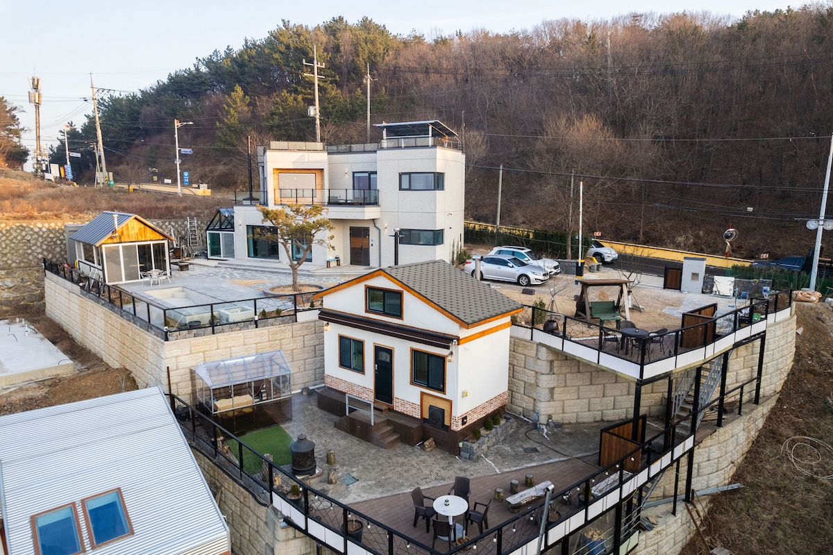 Haewol.. Como la luna sobre el tranquilo mar Es un anexo pequeño pero pequeño, construido de forma independiente junto al mar. Si mirás desde ahí, el mar es hermoso, el cielo es hermoso, las nubes son hermosas, y vas a poder divertirte y descansar de verdad. Por supuesto, es un edificio adjunto, pero es un espacio completamente independiente y se puede disfrutar de juegos de fuego, barbacoa y hora del té en la cubierta con vistas al mar. La característica principal es que, como su nombre indica, hay una sala de esferas en el agung donde puedes poner tu cintura sobre un fuego de leña. Por el contrario, en verano, el piso es de mármol de arcilla roja, por lo que el piso es fresco. Cada habitación tiene aire acondicionado, y la zona de parrilla tiene aire acondicionado y una chimenea para fuegos artificiales. Hay un inodoro afuera. En el verano, preparamos una pequeña pileta para 2-3 personas para disfrutar con coordinación previa (costo 30.000 KRW). ¡Experimentá una pequeña playa a la que se puede llegar en 5 minutos a pie!