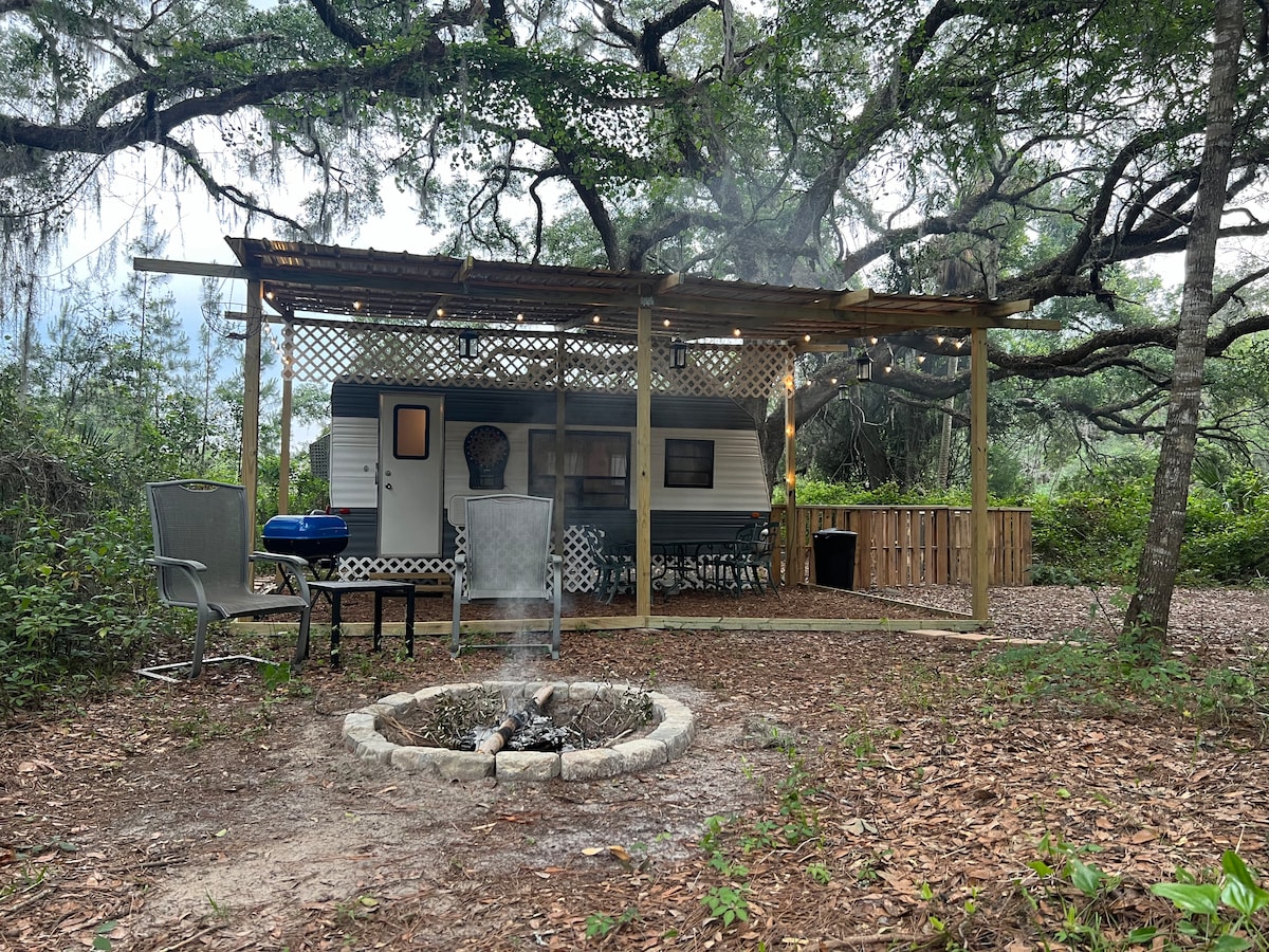 Experimenta la belleza del país de la Vieja Florida mientras te encuentras en el centro entre muchos manantiales naturales, parques estatales, el famoso río Suwanee y el Golfo, ¡todo a poca distancia en coche! Un entorno rural tranquilo y privado, donde puedes disfrutar de los majestuosos robles vivos mientras te sientas junto a una fogata contemplando las estrellas después de un día de exploración con tus seres queridos(humanos y/o perros). ¡Trae tu tienda de campaña y acampa en el patio si lo deseas! Lo más importante es pasar un tiempo invaluable juntos y crear recuerdos.