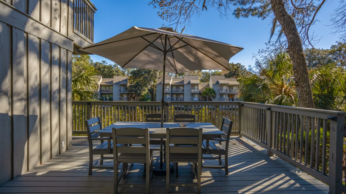 "Coastal Dunes Villa" **New Trex Deck October 2024” Located in the Queens Grant community of Palmetto Dunes Resort, along the oceanfront championship Robert Trent Jones golf course, short walk to the beach, pickleball and tennis courts, General Store and a short bike ride to Shelter Cove Marina. Several options for dining and shopping nearby. Enjoy open concept living within our beautifully renovated space.